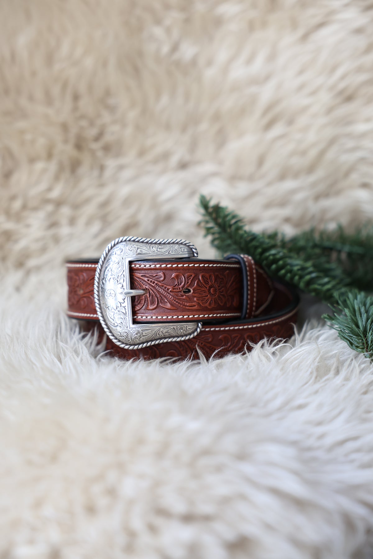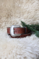 Saddle up with authentic western style. This chestnut leather belt features intricate floral tooling that captures the spirit of the frontier, paired with a gleaming silver buckle that commands attention. Hand-crafted details and rich, warm tones make it the perfect finishing touch for any outfit—from ranch wear to night out. Durable leather construction ensures this belt will age beautifully and last for years. A timeless piece that blends rugged charm with refined elegance.