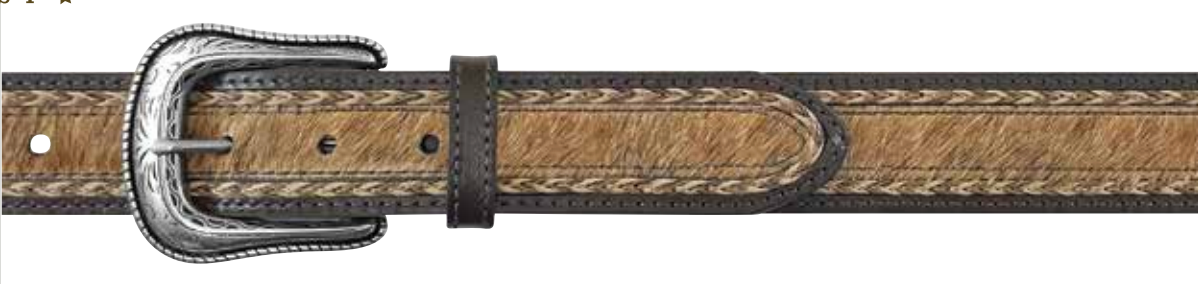 Classic roper belt crafted from genuine leather with natural hair-on-hide texture. Features hand-stitched edges accented with traditional horse hair braid detailing and a polished silver-finish buckle. The 1 1/2" width delivers authentic Western style with timeless appeal. Perfect for ranch work or everyday wear that demands durability and character.