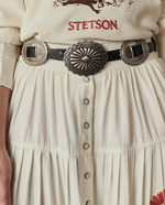 The striking collaboration between Stetson and The Great. Crafted from premium tooled leather, this belt features authentic concho detailing that captures the spirit of classic ranch wear. The intricate tooling showcases traditional craftsmanship, while the distinctive conchos add a bold statement to any outfit. Perfect for pairing with jeans, boots, and your favorite Western pieces, this belt combines timeless design with quality construction. A versatile accessory that brings genuine character to your wardrobe.