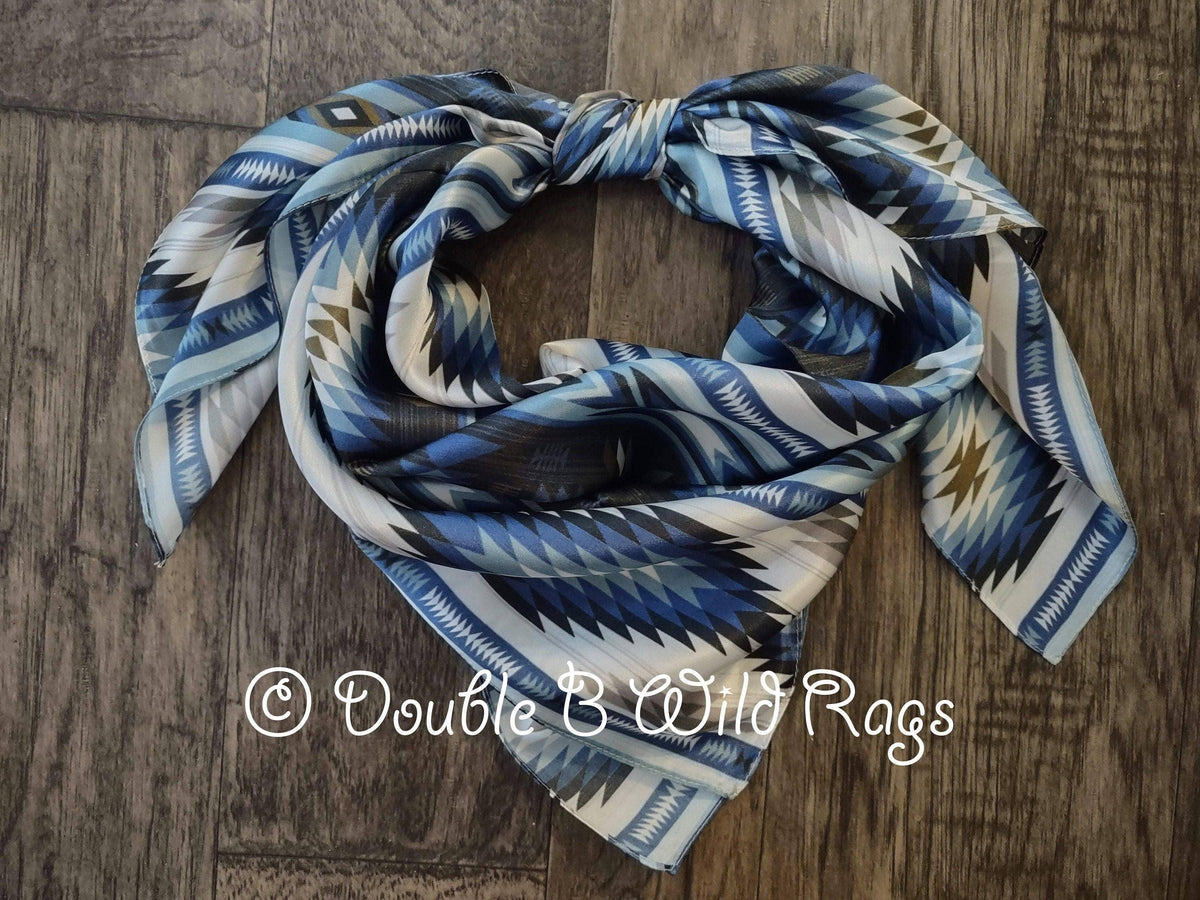 Experience elegance with the Wild Rag crafted from 100% silk, featuring a striking Aztec pattern in shades of blue and silver.