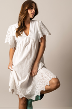 The Kimes Ranch Kelsey Dress combines effortless style with charming details. This versatile piece features a flattering V-neckline and delicate eyelet trim adorning the shoulders and hemline, adding a touch of feminine elegance. Perfect for casual outings or dressed-up occasions, the Kelsey offers comfort and sophistication in one timeless design.