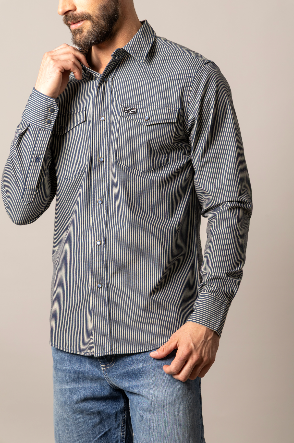 The Kimes Ranch Mens Quentin Shirt delivers authentic western style with classic snap closures and a structured western yoke. Featuring bold indigo stripes, this versatile piece transitions seamlessly from ranch work to casual wear. Built for durability and comfort, it's an essential addition to any western wardrobe.