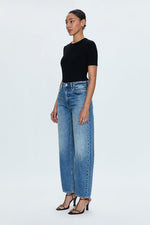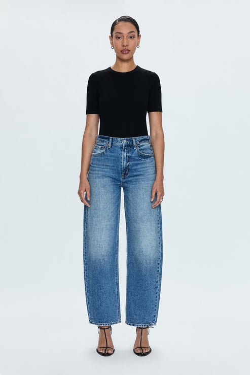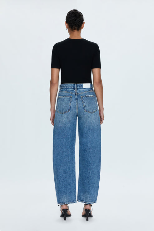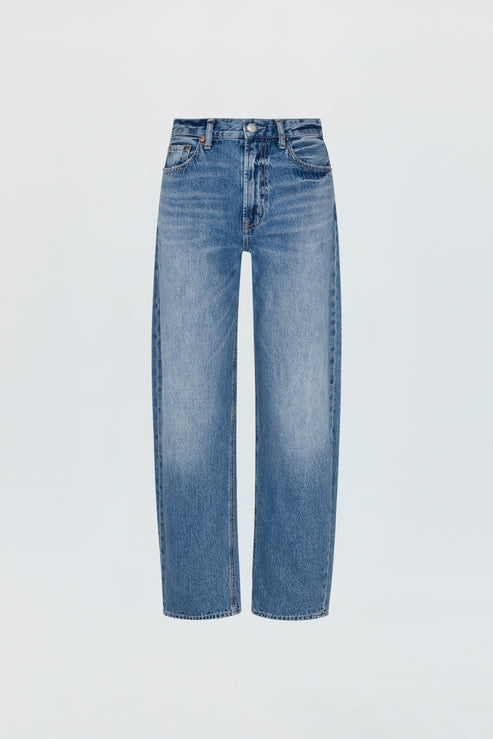 The best-selling jean that redefines modern denim. Wes sits at a flattering high rise with a stylish barrel leg silhouette and full-length 30" inseam that creates sophisticated drama. Clean hem finishes add polished detail to the contemporary silhouette. Crafted from our premium rigid non-stretch denim in Spectacle, a vintage inspired medium blue wash with moderate fading and free of distressing for polished, lived-in perfection.
