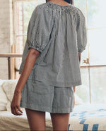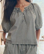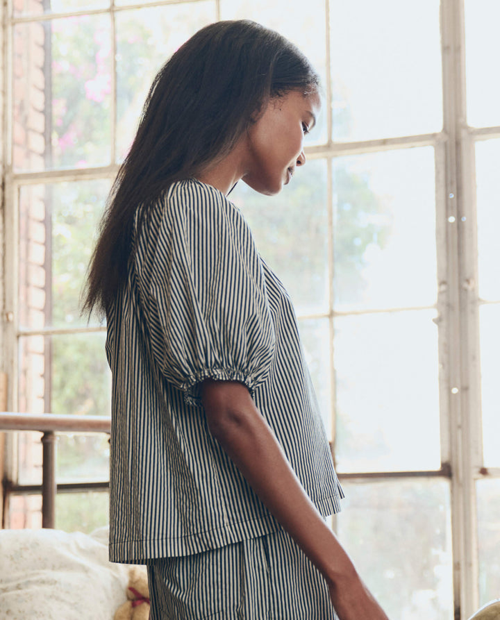 The Great Smocked Sleep Top combines timeless elegance with everyday comfort. Crafted in a refined black and cream stripe, the smocked detailing adds subtle texture and visual interest to this versatile piece. Perfect for restful nights or leisurely mornings, this top transitions effortlessly from bedroom to casual wear. The breathable fabric and relaxed fit ensure all-day comfort, while the classic striped pattern complements any wardrobe. A sophisticated essential for those who refuse to compromise on style.
