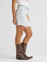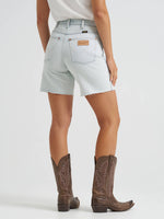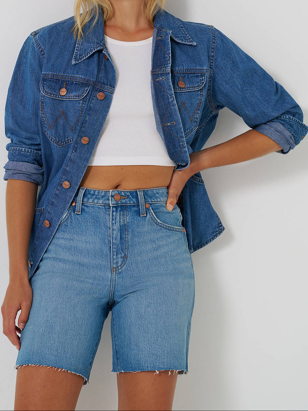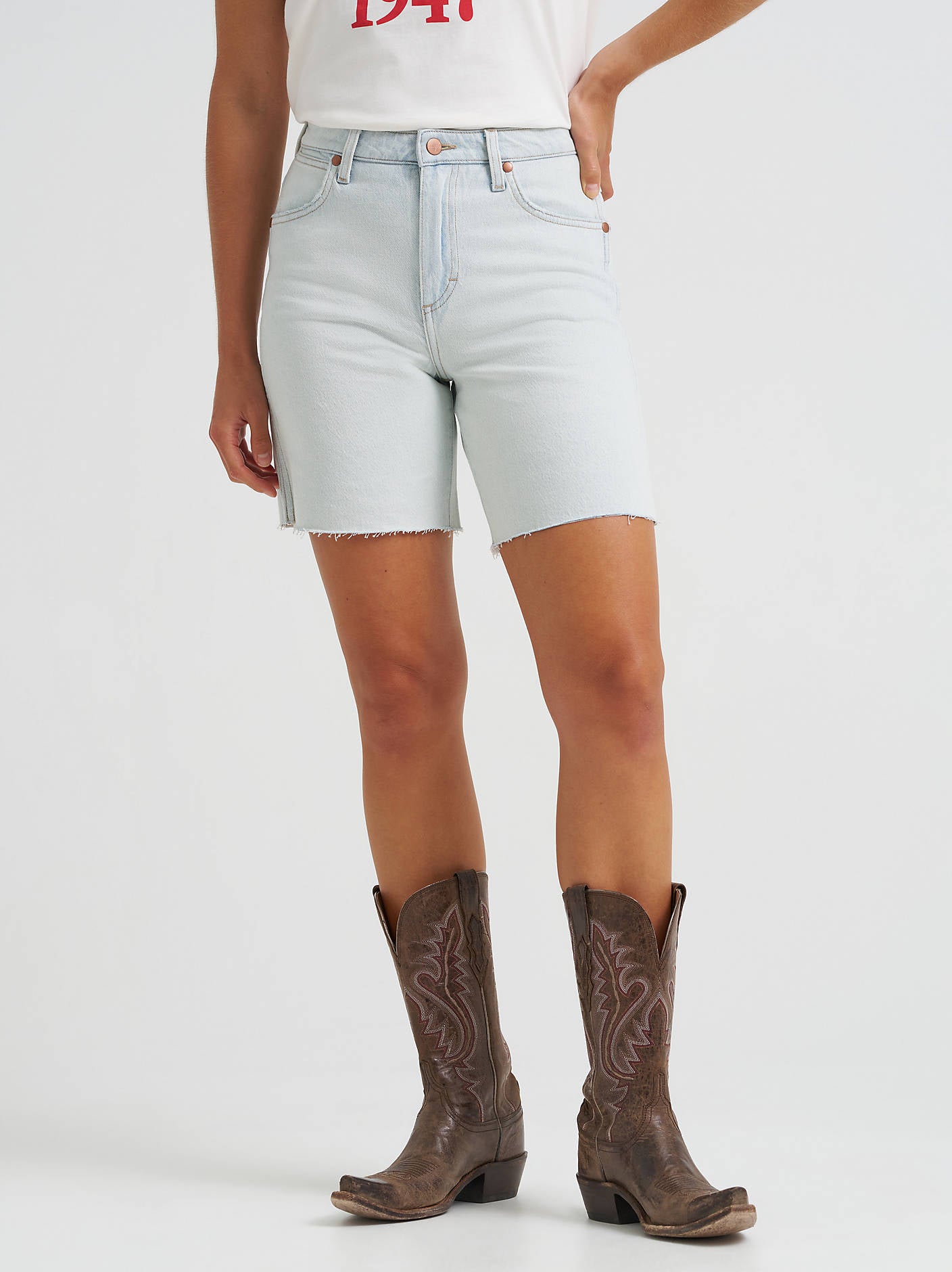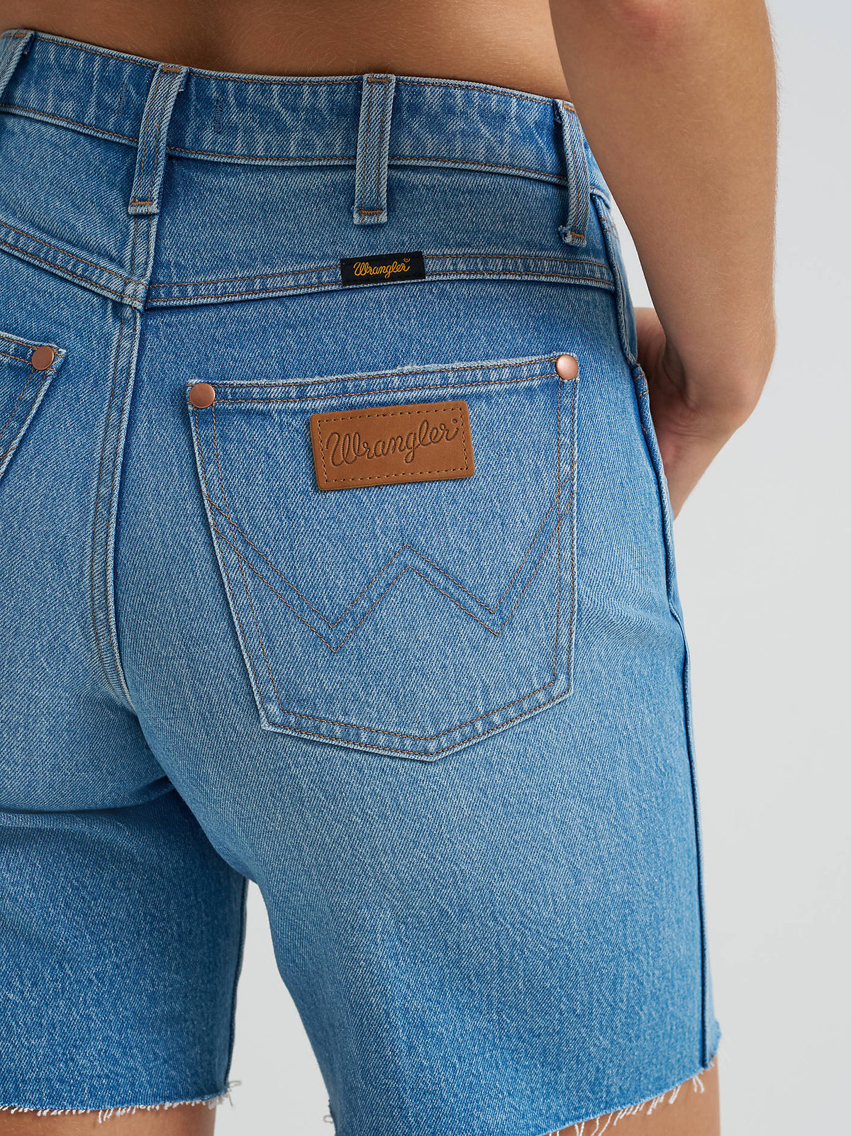 Flattering and full of attitude, the Women's Longline Cowboy Short is your go-to for warmer days. Crafted from a cotton blend with a hint of stretch, these slim-fit cutoffs deliver comfort that lasts all day. A longer 7" inseam and raw hem give them a laidback vibe with minimal fray. These high-rise denim shorts are finished with the signature five-pocket styling, ‘W’ stitching, and a logo patch, bringing authentic Wrangler® heritage to every outfit in the season ahead.