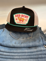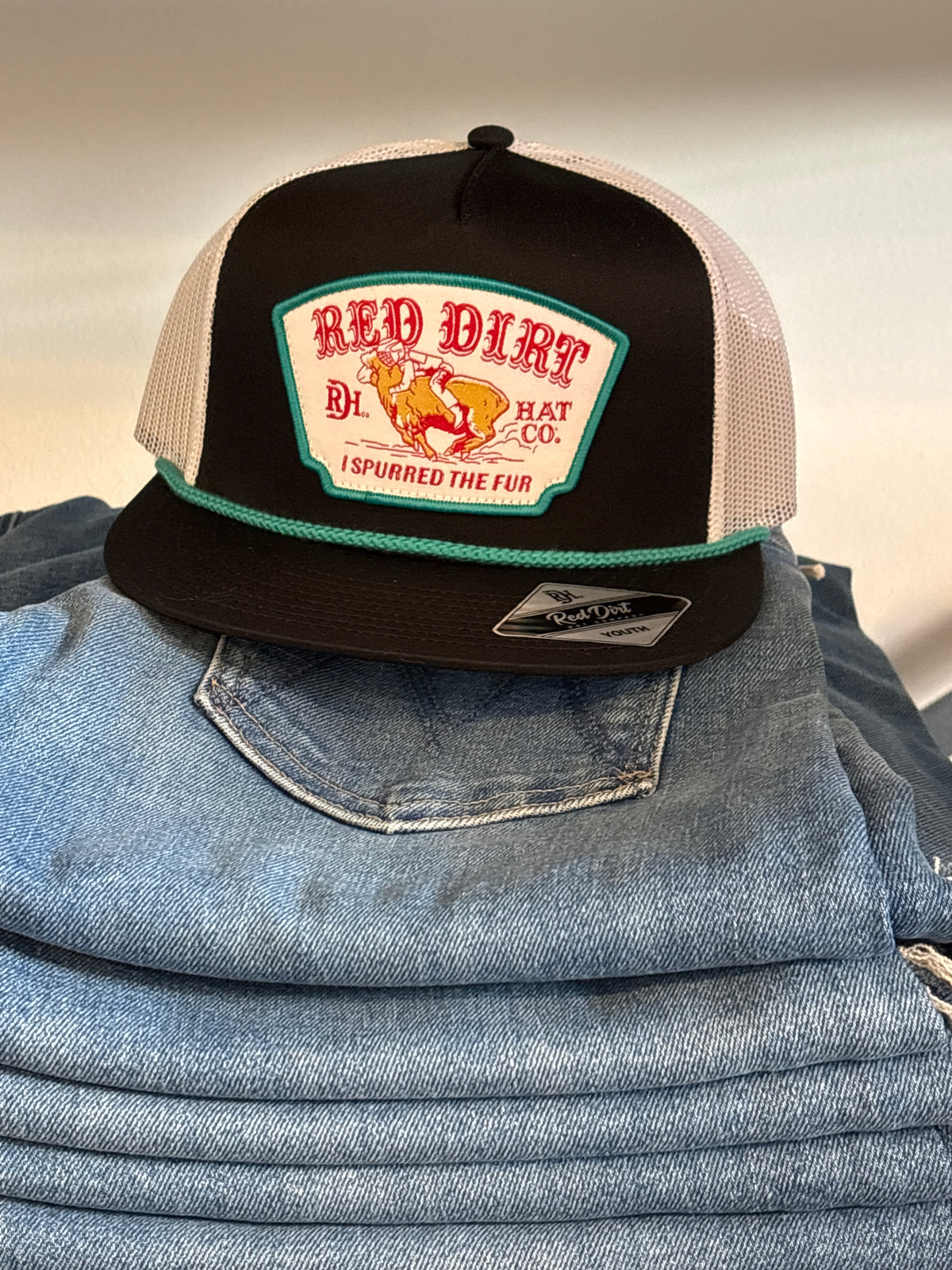 Black and White with white patch with a Turquoise patch and turquoise twill band