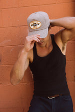 Tulsa Hat: Soft 100% Cotton Pin Stripe 5-panel cap with soft structured crown. Slight curved visor with plastic snap closure. Front logo is soft felt merrowed patch with chain stitch embroidered details. Color: Dark Grey/Ivory