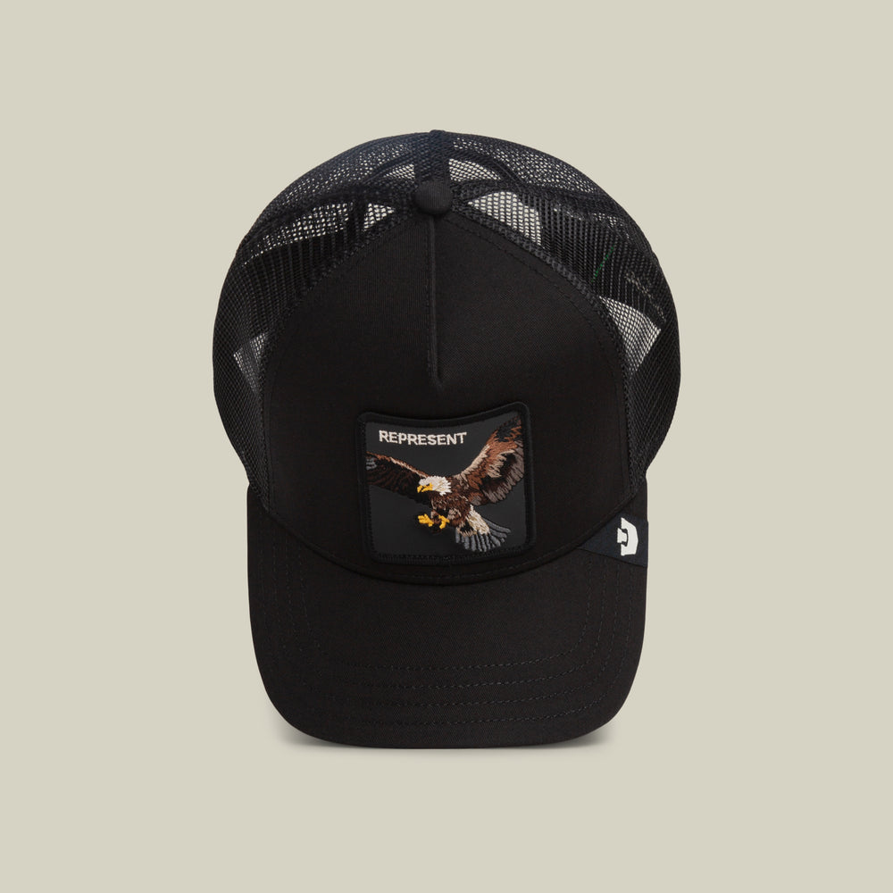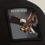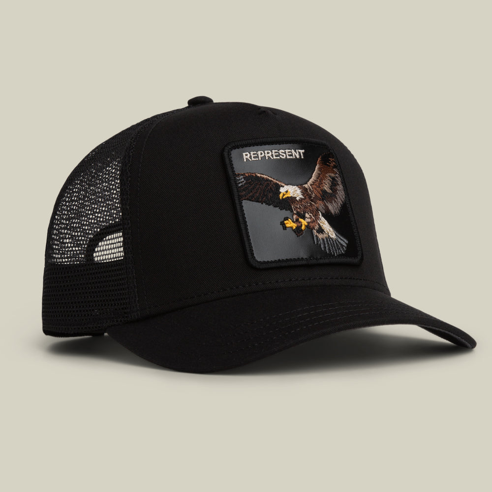 A classic trucker offered in black or tan with green, both stamped with a flying eagle patch that says REPRESENT and means it. Wings wide, claws ready, no confusion about where you stand. Eagle patch authority, clean colorways, and a reminder that showing up counts more than shouting.
