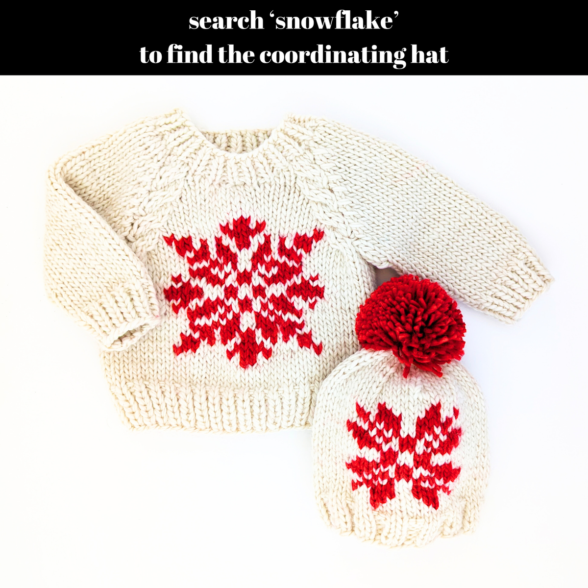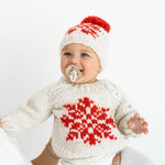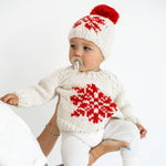 This hand-knit sweater features a snowflake design in red yarn on the front, adding a charming touch to your child's winter wardrobe. The Natural hued color and chunky yarn provide a cozy feel, while the raglan sleeves with cable knit detailing add a touch of sophistication. With its soft neckline, this sweater ensures easy dressing for your little one, making it a practical choice for busy mornings. Our sweaters are partially knit from recycled, sustainable Polyester yarn made from plastic bottles. We are on a mission to help reduce the world's plastic pollution problem ♻ • Hand Knit in China • 60% Acrylic, 40% Recycled Polyester • Hand Wash