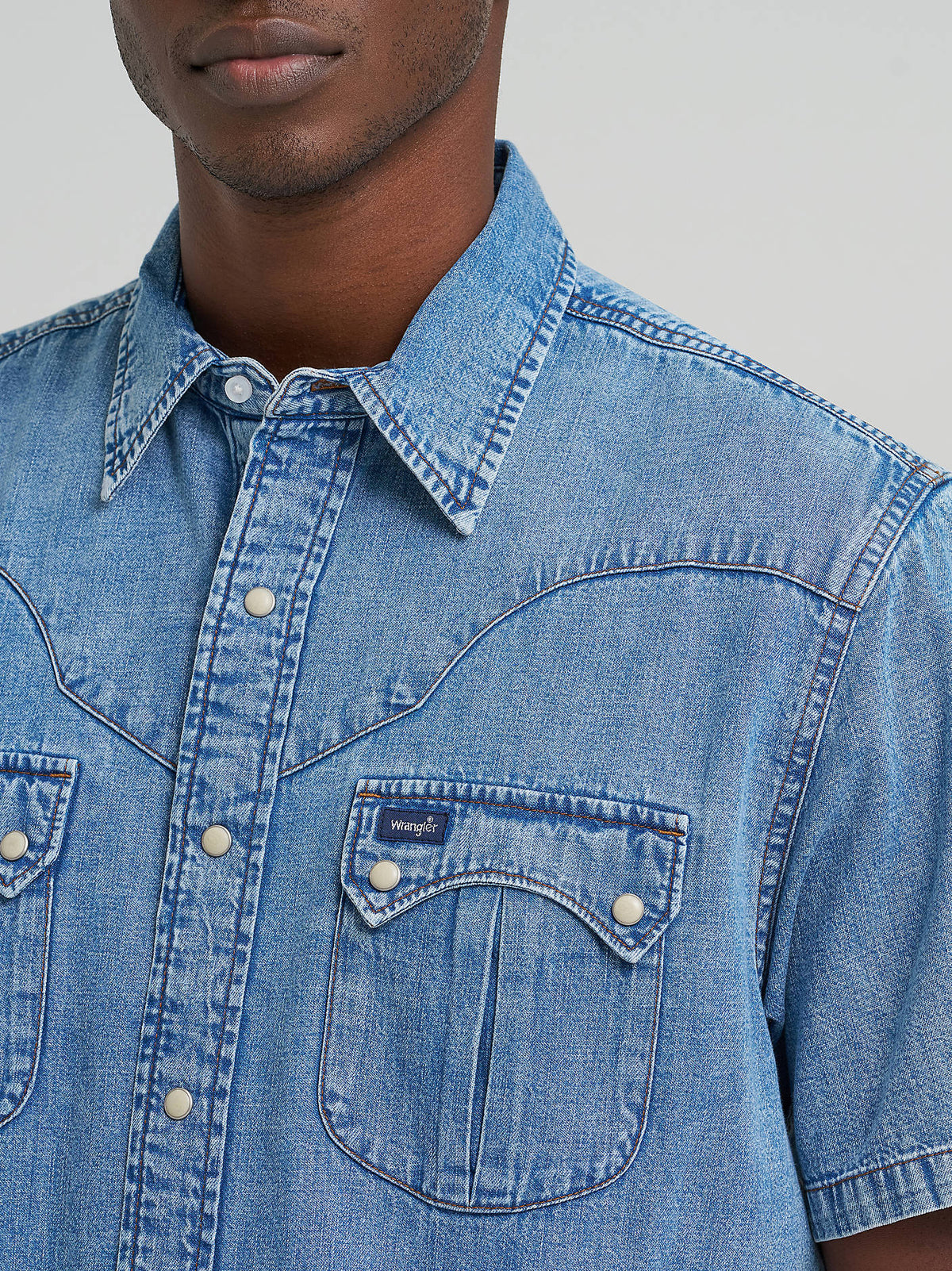 Kick your daily denim look into another gear with this Vintage-Inspired Sculpted Yoke Denim Snap Shirt. It’s cut with a regular fit offering just the right amount of room and made of 100% cotton in a versatile blue wash you can pair with anything. This short-sleeve collared shirt remixes some of the iconic details you love, including curved yokes from front to back, sawtooth flap pockets with some pleated detailing, and pearl snaps.