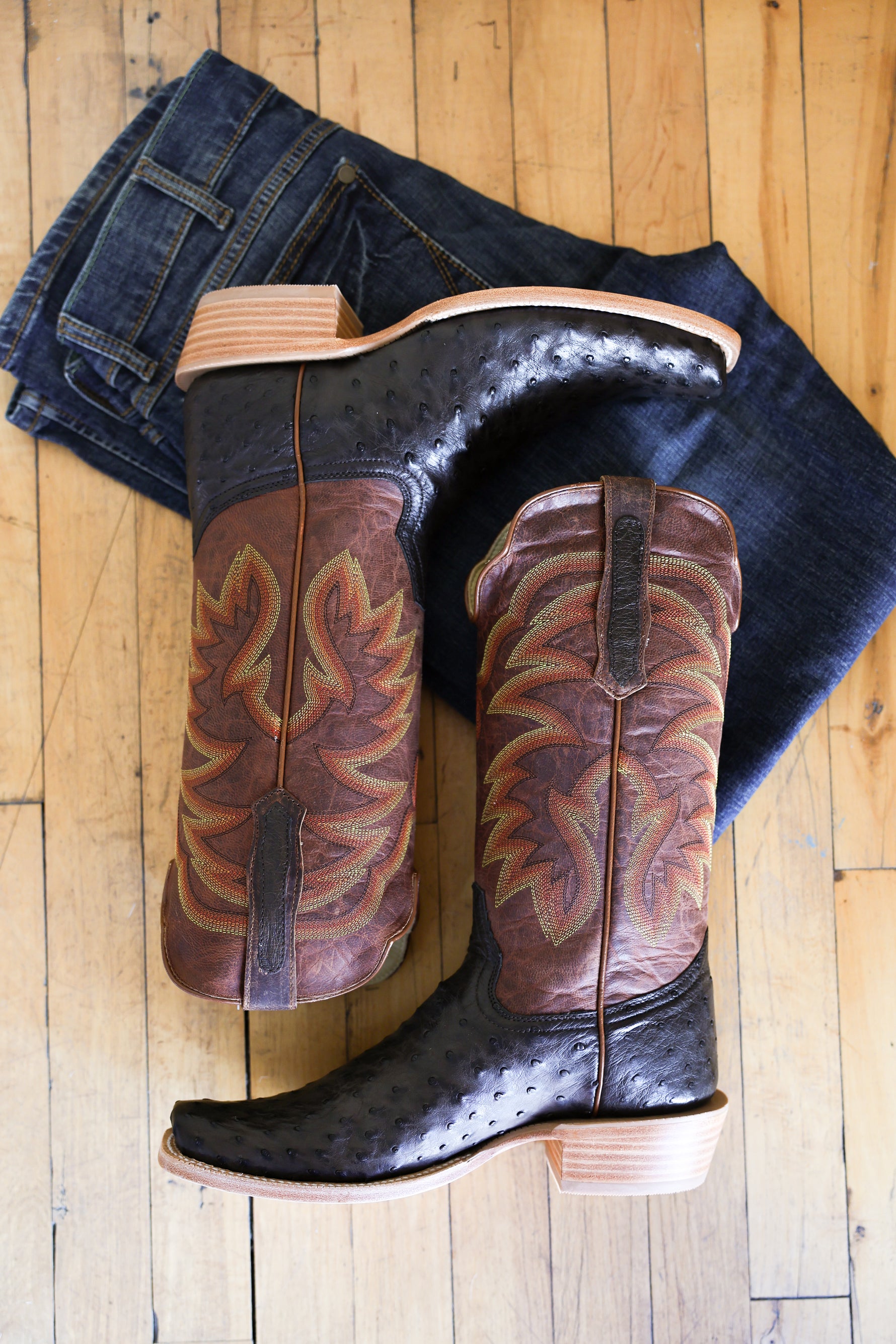 R. Watson presents these full quill ostrich and cowhide exotic western boots. These boots have a 10 row stitch pattern, R. Watson comfort system, all leather stacked heel, counters, solid steel shank, and 10 iron outsole. 13″ total in height.