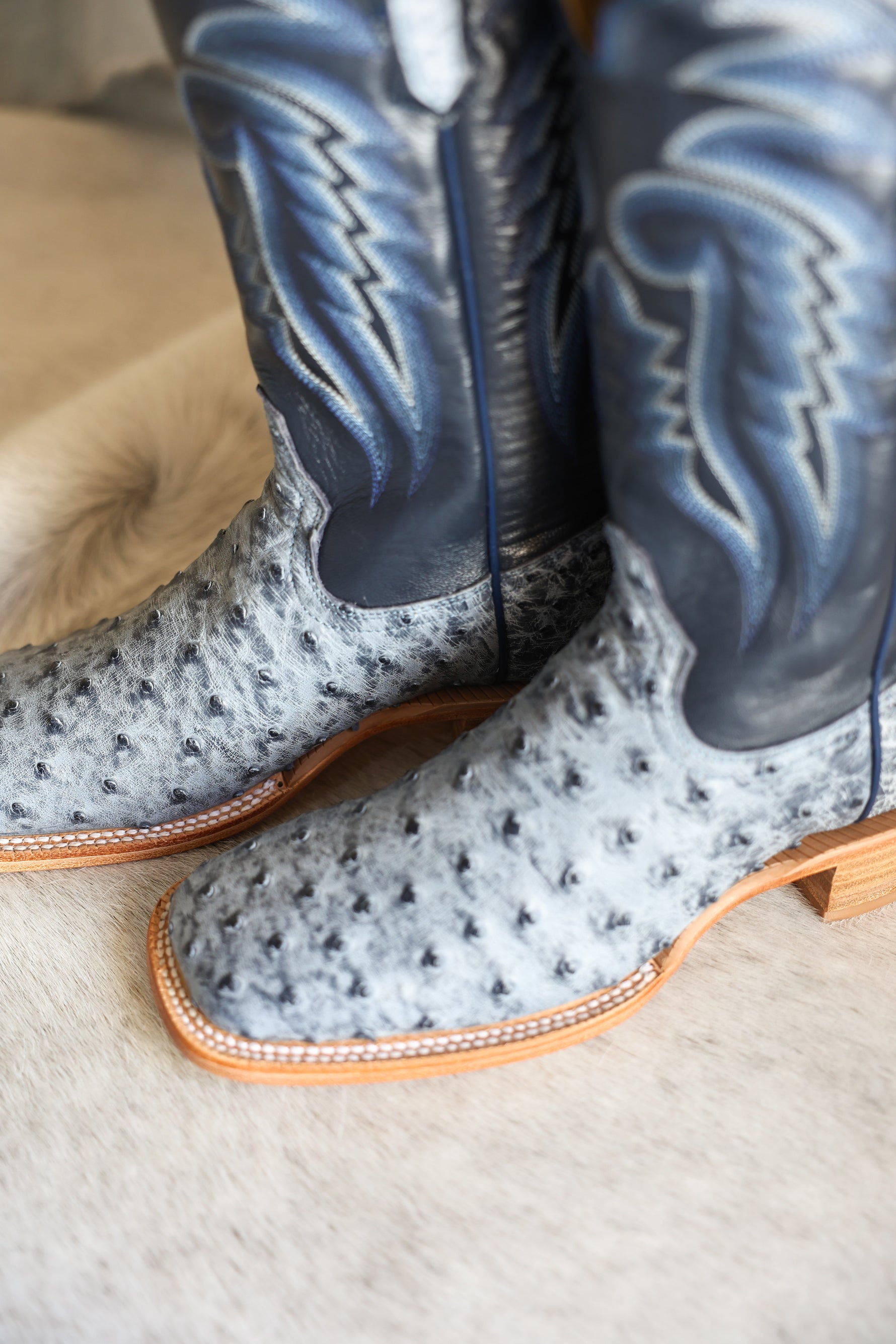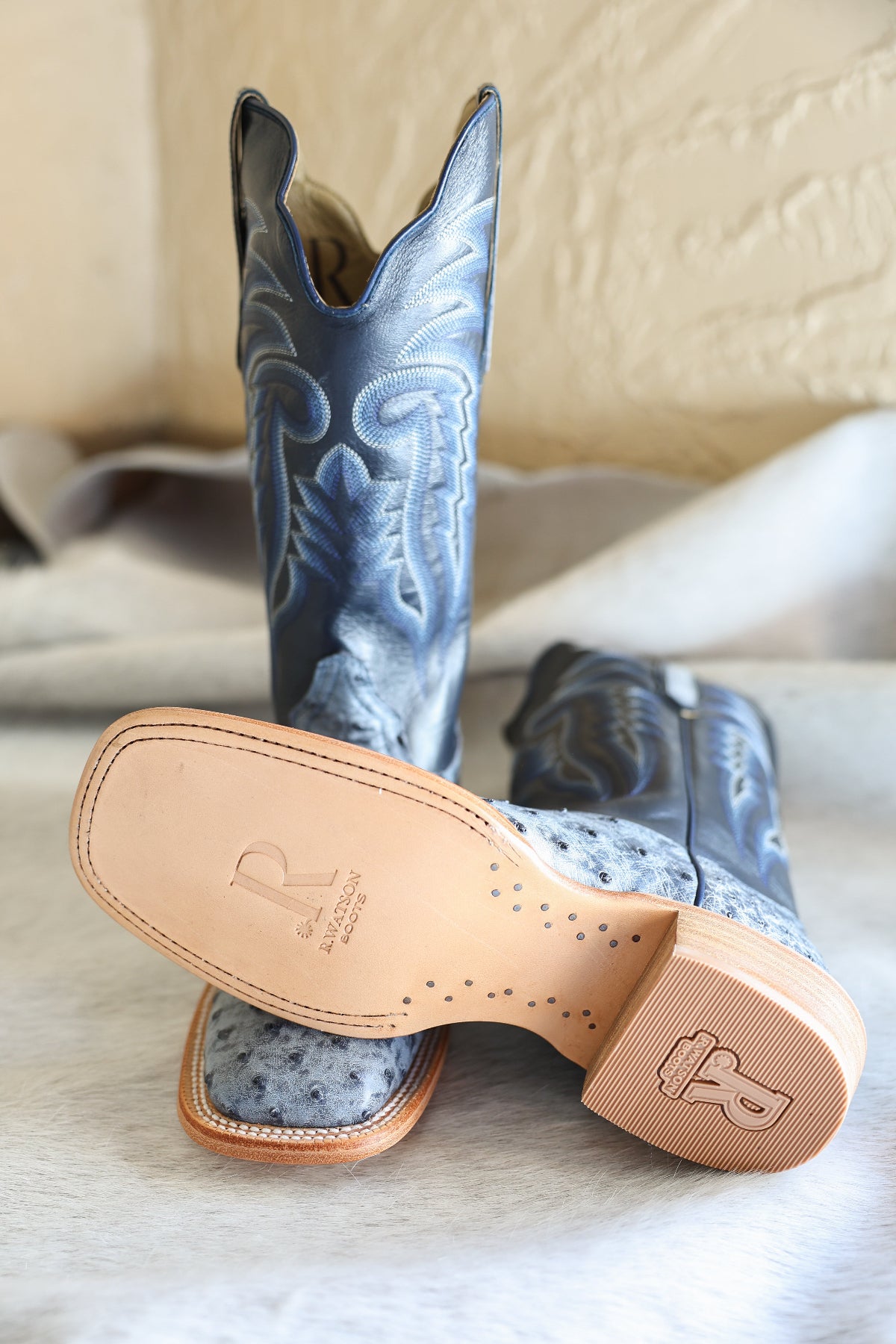 R Watson Mens Ostrich Denim Boot mens blue cowboy boots navy denim Boltranchstore.com Free Shipping