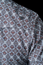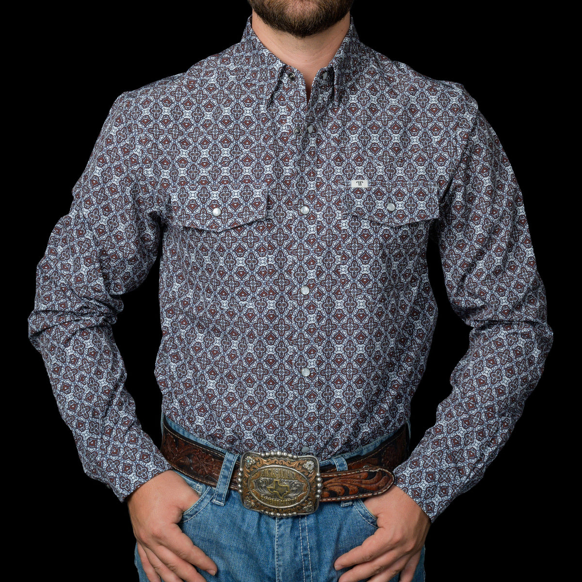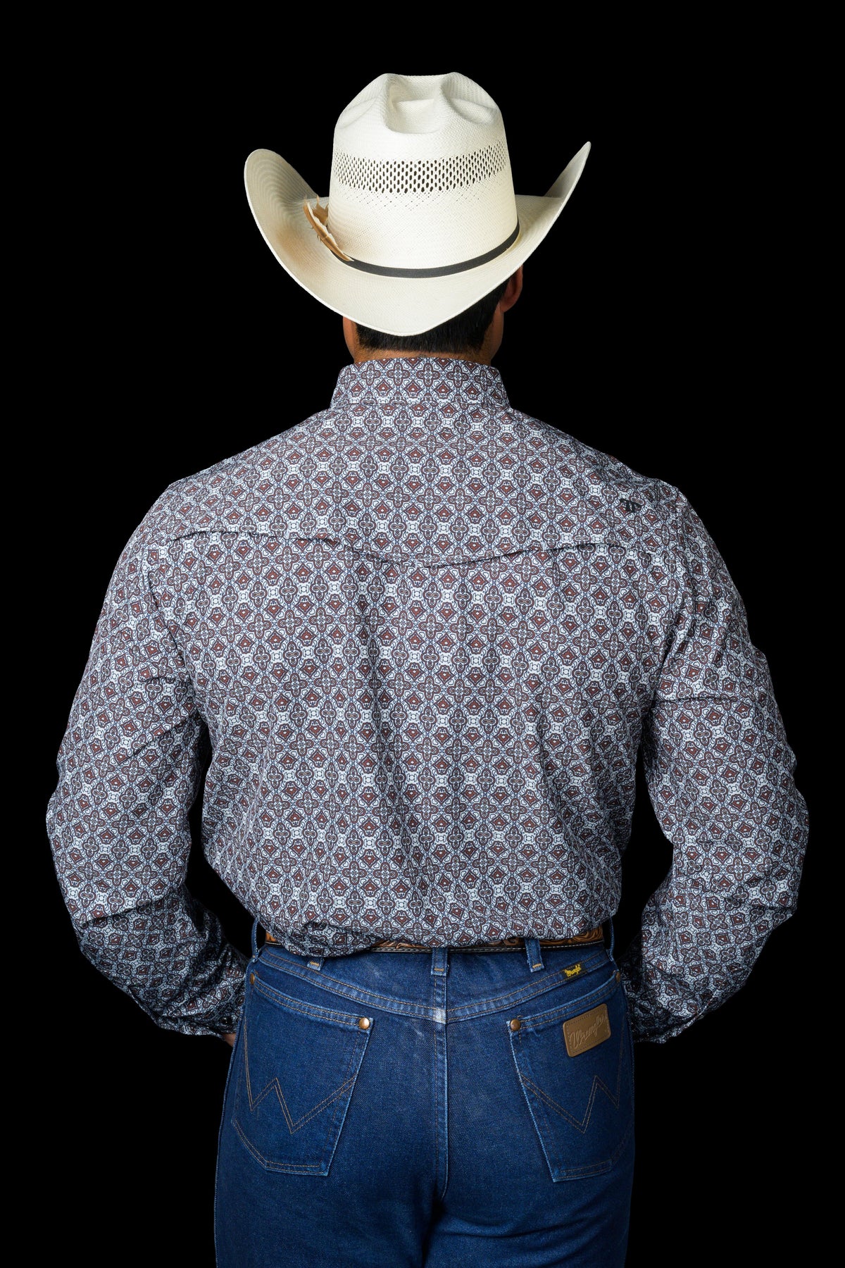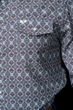 A rich brown geometric print that brings depth to a classic western snap. Built in a long-sleeve silhouette with a clean, structured drape, it’s made from breathable, soft-stretch fabric that holds its shape from early mornings to late nights.