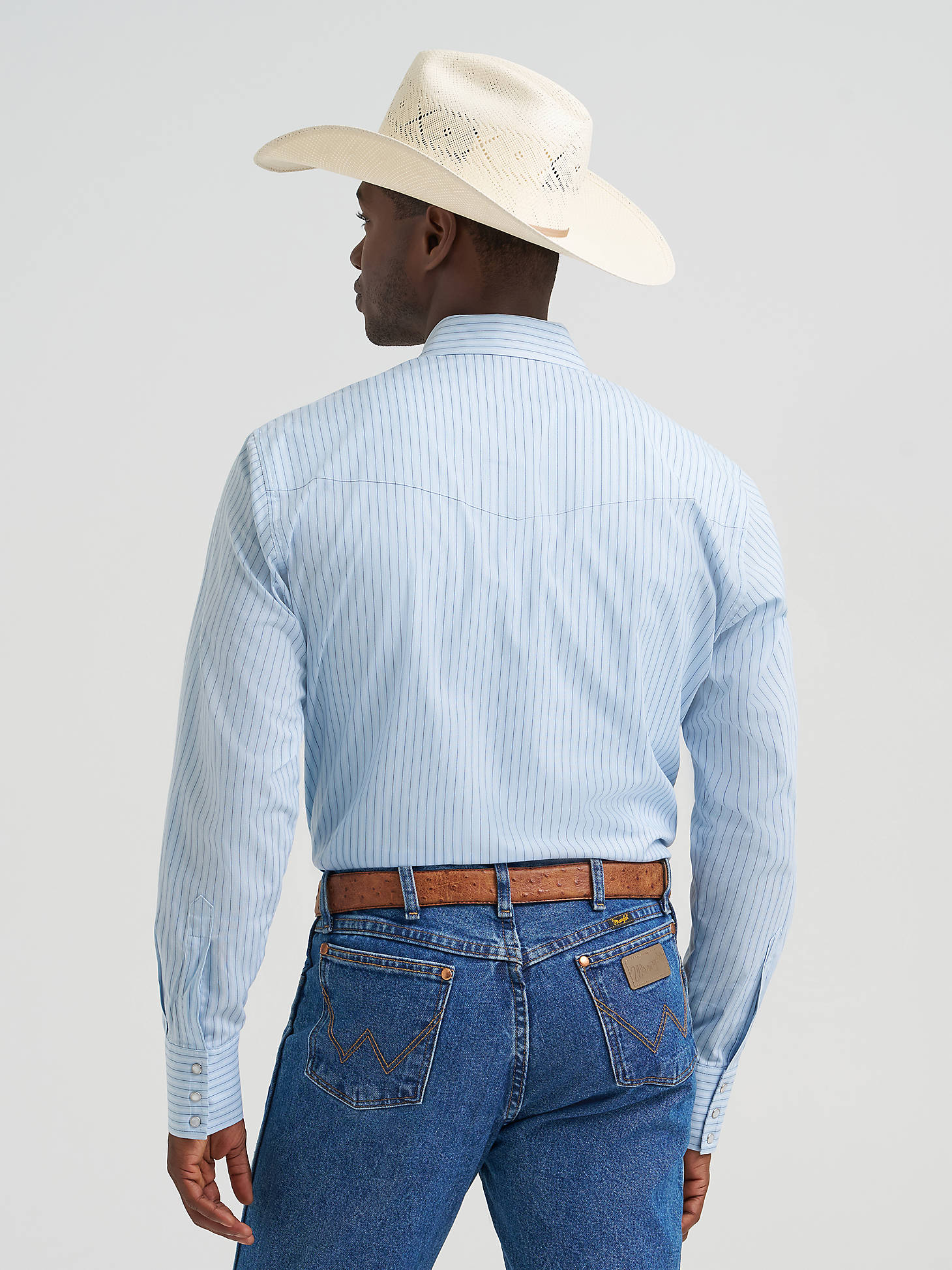 blue striped wrangler pearl snap button up long sleeve cowboy shirt boltranchstore.com Wrangler