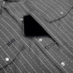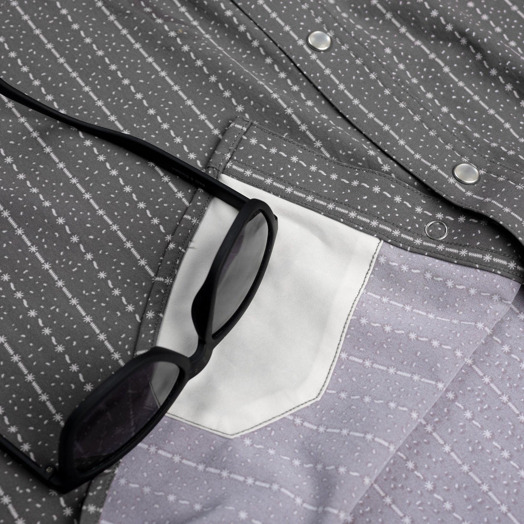 gray button up shirt with sun and squiggle pattern pearl snaps collar short sleeve western style double pocket The Hondo at boltranchstore.com Poncho outdoor