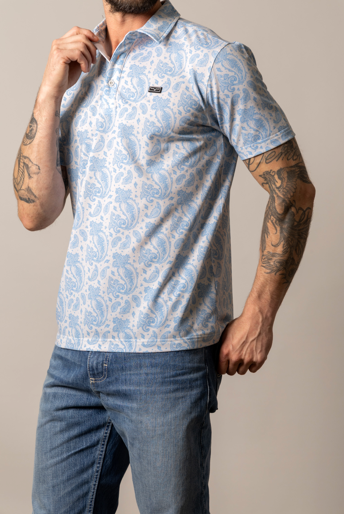 The Kimes Ranch Mens Burel Polo Shirt combines classic style with everyday comfort. Featuring a striking paisley pattern in blue and white, this short-sleeve polo delivers a polished look perfect for ranch work or casual wear. Quality construction ensures durability through active days, while the breathable fabric keeps you comfortable in warm weather. A versatile piece that transitions seamlessly from work to weekend.