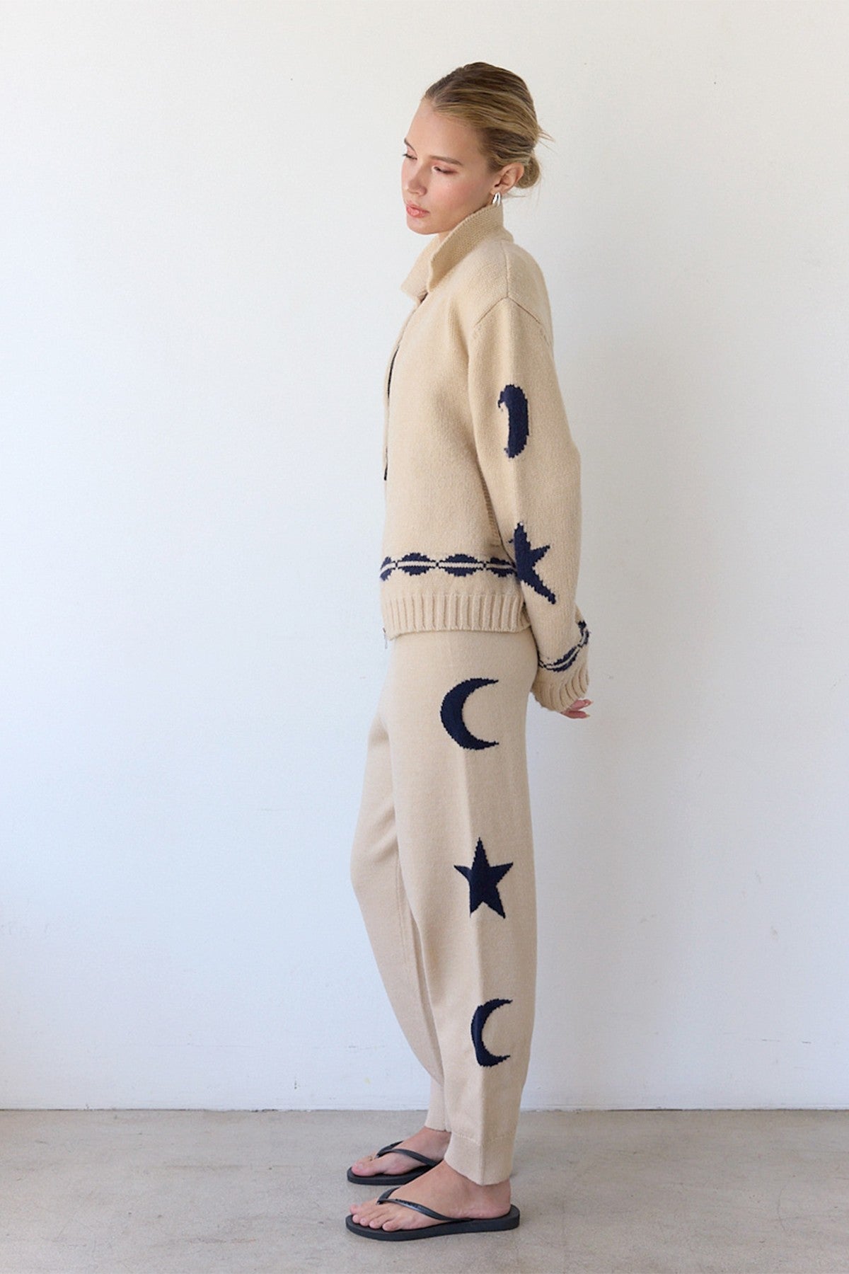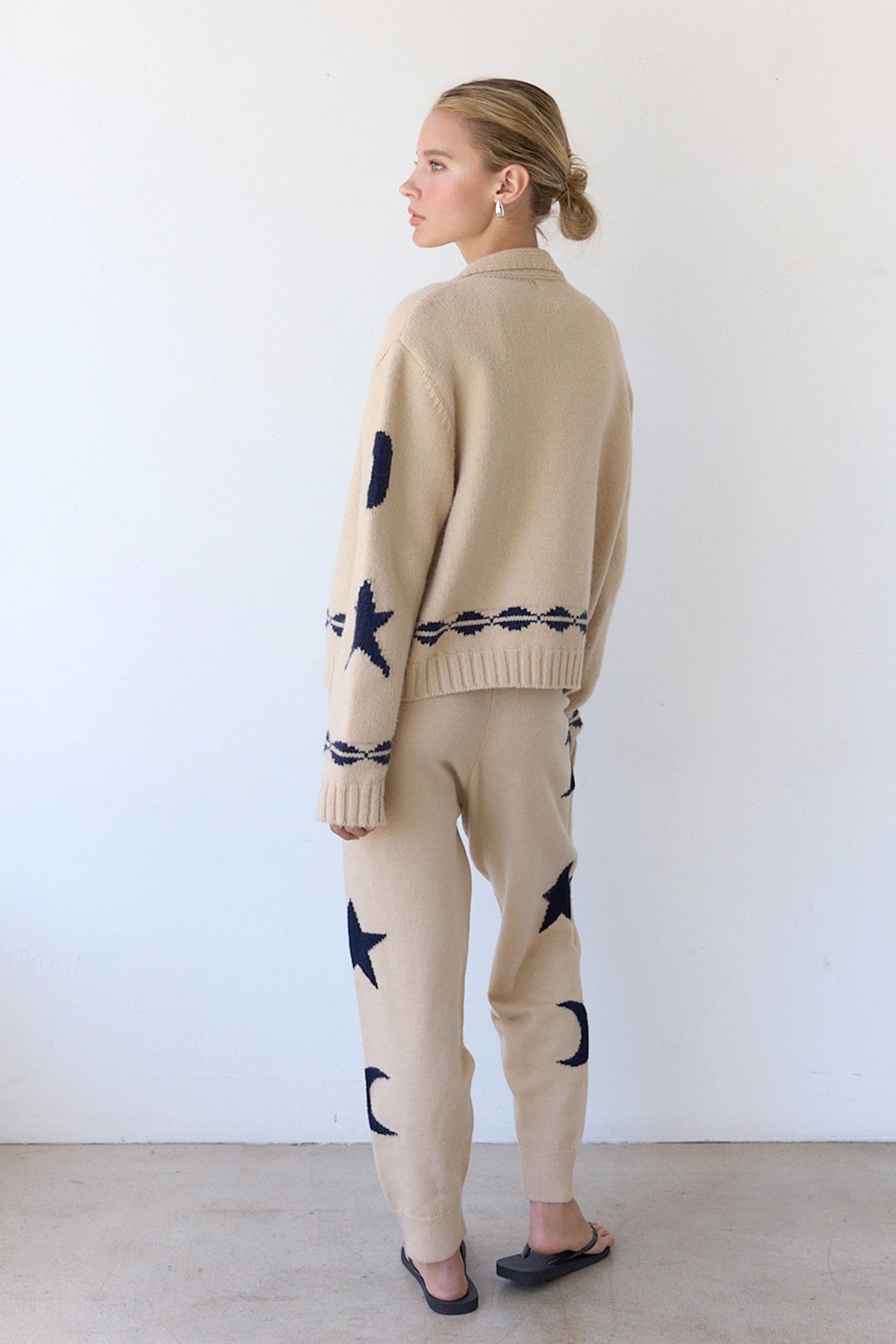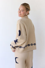 This cozy patterned sweater jacket features a simple collar and a convenient zip-front closure. Designed with a relaxed drop shoulder fit, it includes handy side pockets for added comfort and functionality.