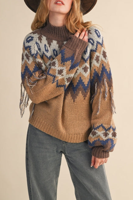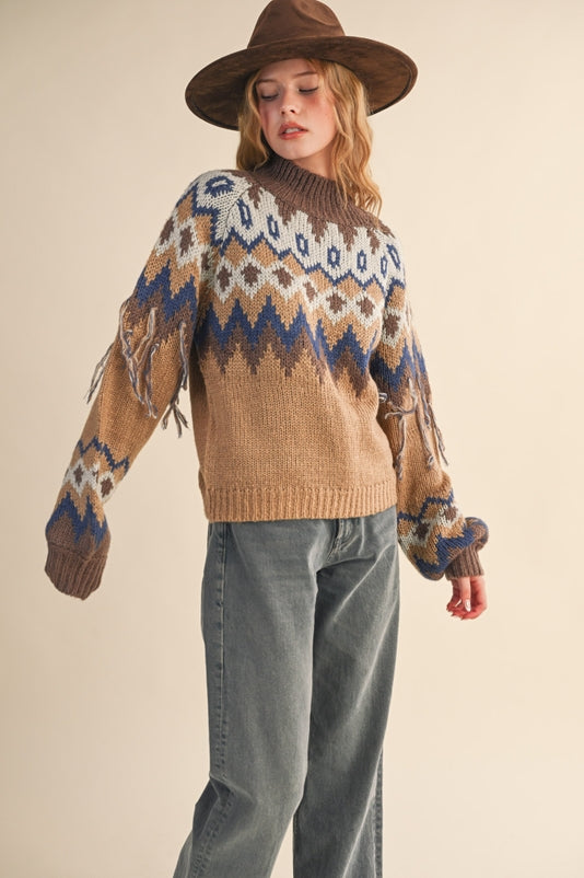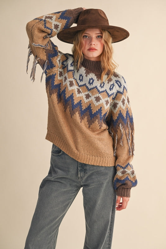 This mock neck sweater featuring a classic Fair Isle pattern and eye-catching fringe on the sleeves. Designed with a ribbed mock neckline, comfortable raglan seams, and long puff sleeves, it combines cozy warmth with fashionable details. Finished with ribbed cuffs and hem for a perfect fit, this sweater is a standout choice for chilly days.