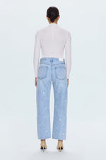 A best-selling silhouette, Lexi sits at a mid-rise with our signature bowed straight leg and a gentle curve through the knee that creates subtle dimension. The cropped 29" inseam tapers cleanly at the ankle, striking the ideal balance of ease and structure. Crafted from rigid denim in Stellar Vintage, a true light blue wash scattered with delicate star embellishments that add a refined, playful touch.