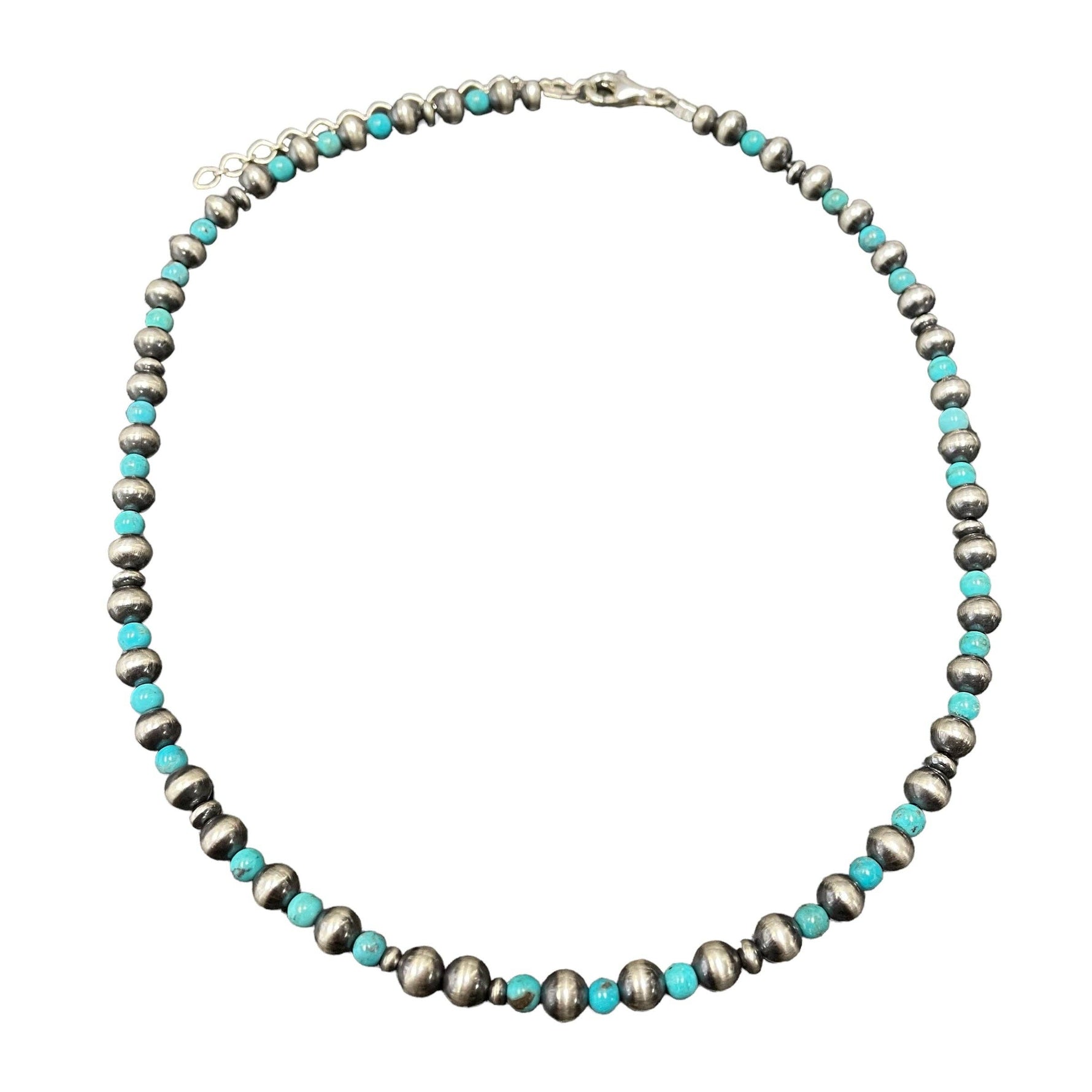 This handcrafted necklace features genuine turquoise beads paired with sterling silver beads for a timeless, understated western look. Designed with 6mm sterling silver beads accented by turquoise throughout, the piece offers a balanced mix of texture and soft color. The necklace measures 18" in length with an added 3" extender for adjustable wear and easy layering. Finished with a sterling silver clasp, this necklace has a refined yet substantial feel, making it a versatile everyday piece that transitions effortlessly from casual wear to elevated western styling.