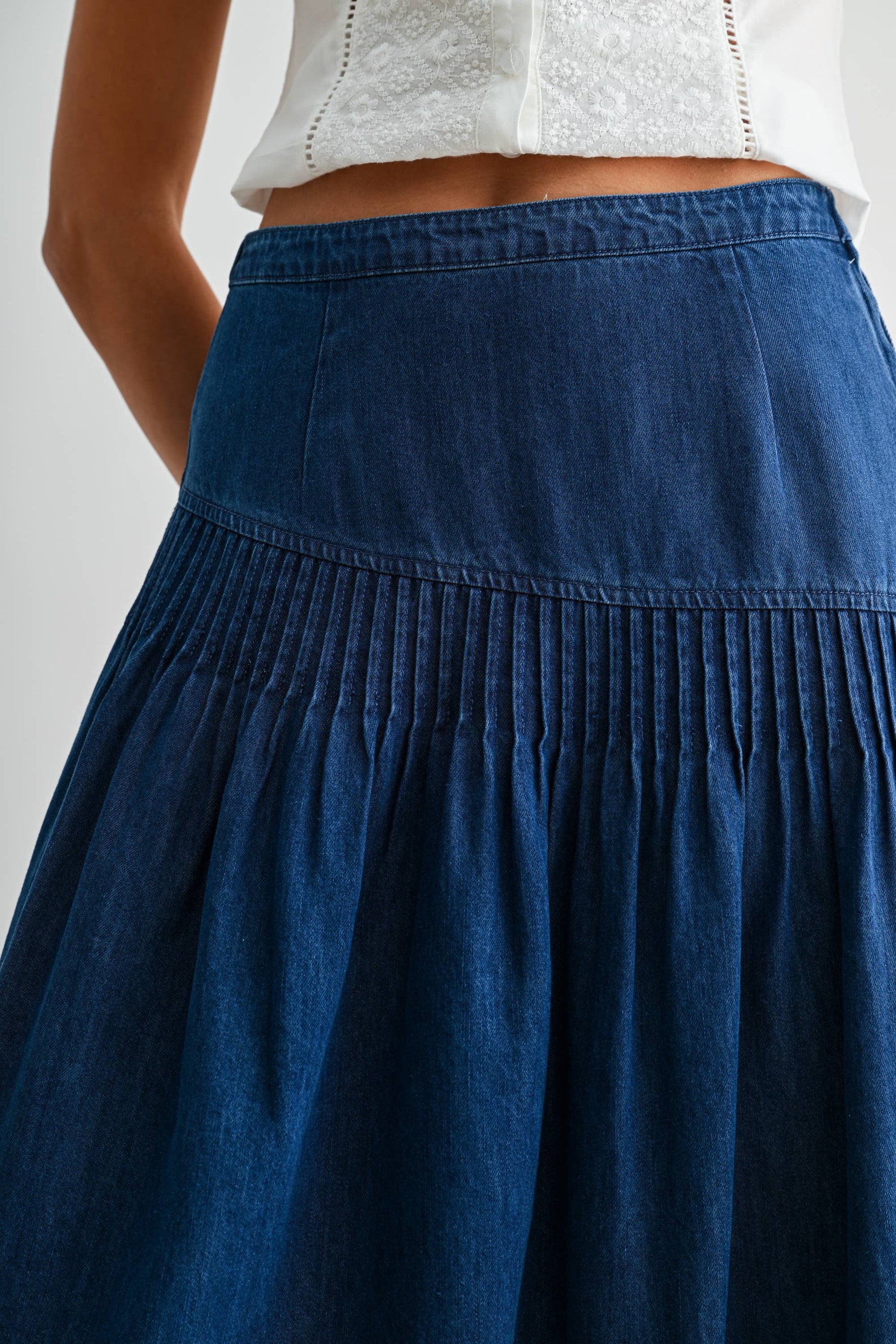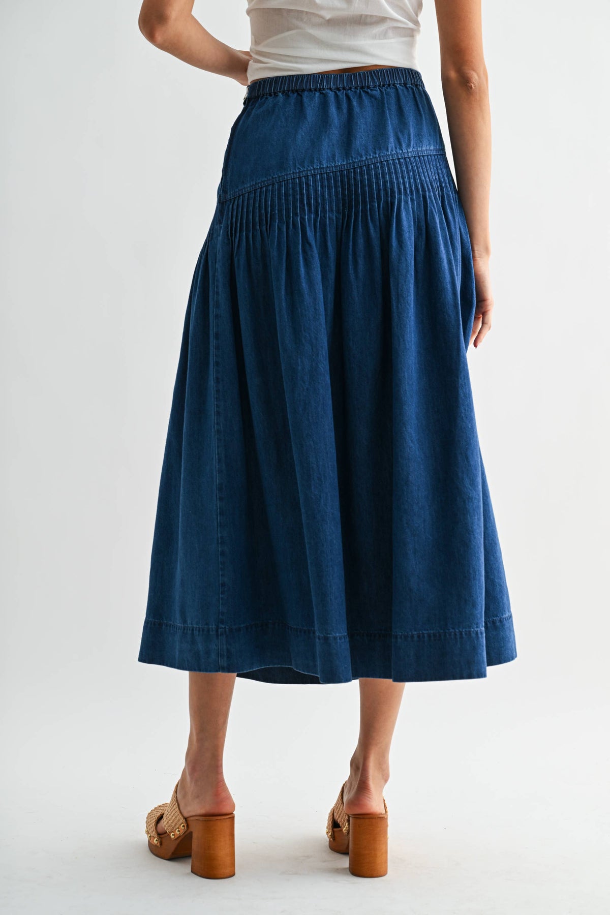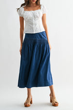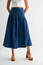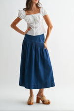 This high-waisted denim midi skirt offers a practical option for everyday wear. Made with sturdy denim fabric, it features a wide waistband and a gathered, slightly flared silhouette that ensures comfort and ease of movement. Its classic blue wash makes it suitable for various casual settings and easy to coordinate with a wide range of tops and footwear.