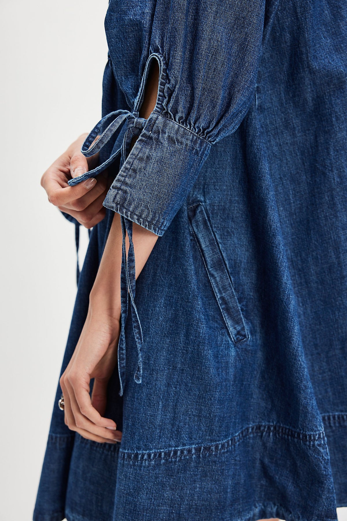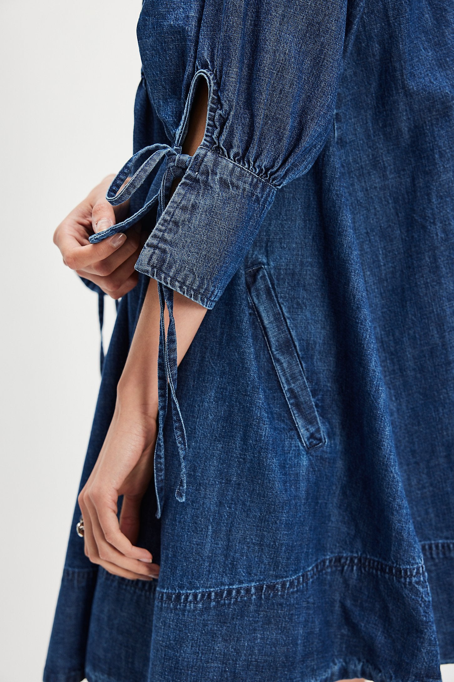 Features: Square neckline, defined long sleeves, pull-on style, side pockets, tie detailing at sleeve cuffs