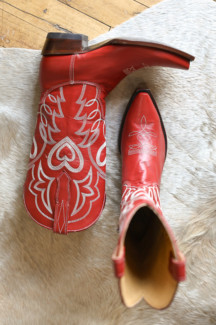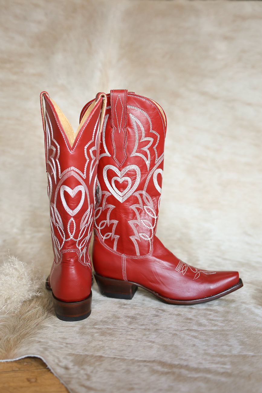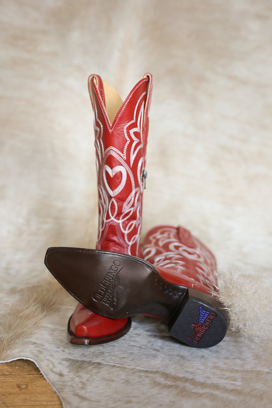 Step into timeless Western style with Old Gringo Womens Heart To Heart Cowboy Boots. Handcrafted from premium leather, these stunning boots feature an elegant snip toe silhouette and eye-catching heart stitching that adds romantic flair to your look. The rich red leather makes a bold statement while maintaining authentic cowboy charm. Perfect for ranch days, country nights, or anyone who loves distinctive Western wear with personality. Experience the quality and craftsmanship Old Gringo is known for.