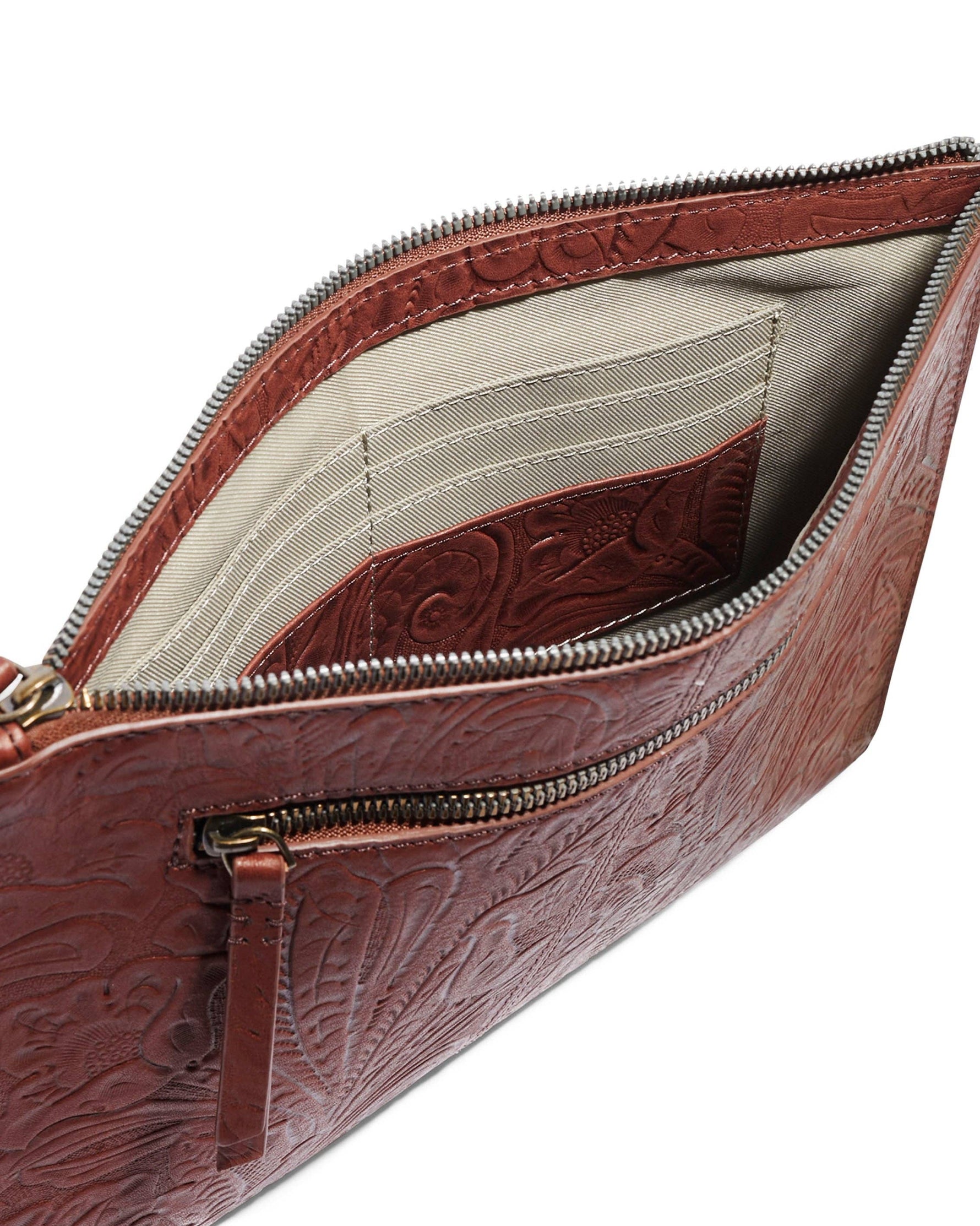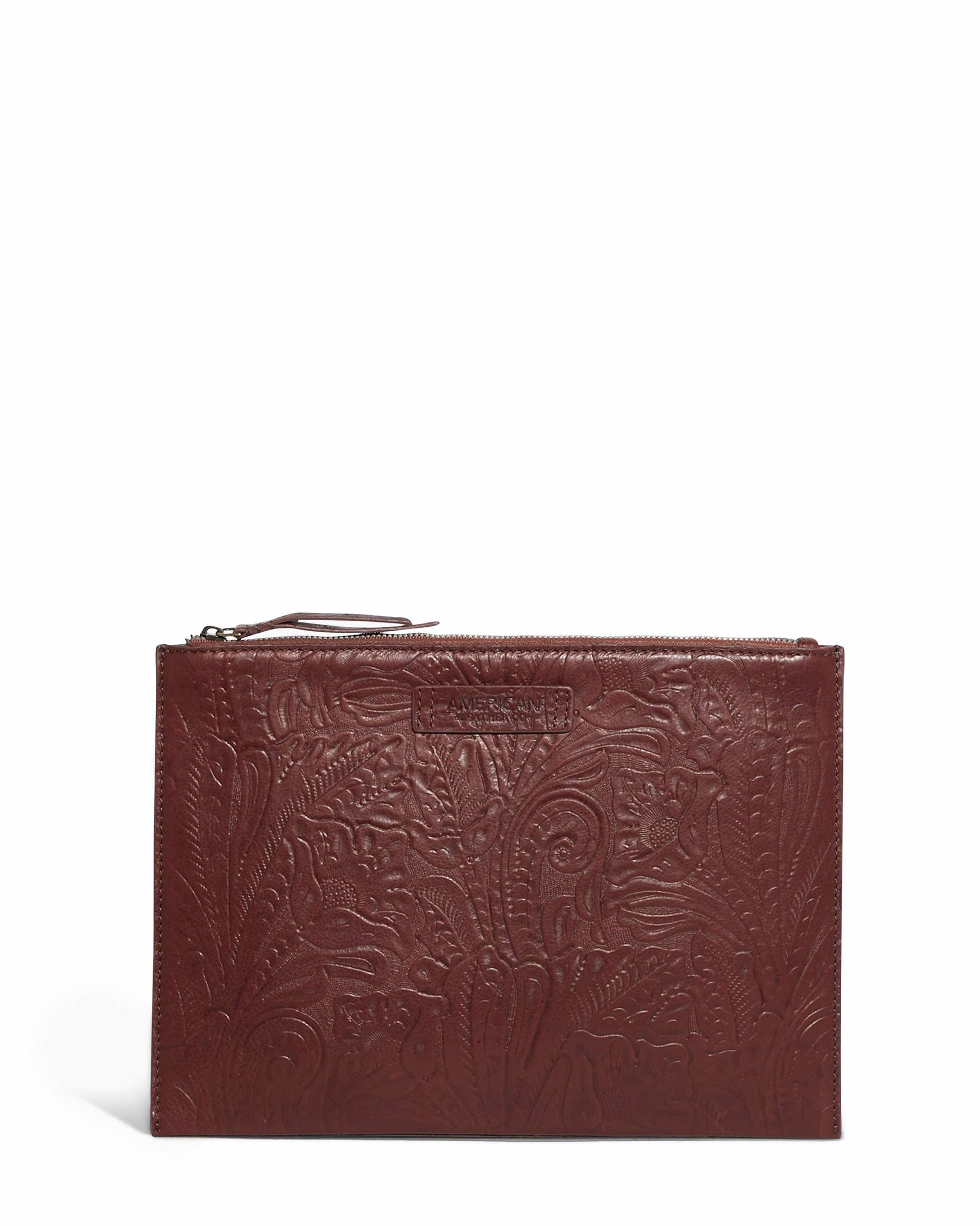 Keep your tablet safe and secure with our River Tablet Tech Pouch. Finely crafted in 100% genuine glove leather, the zipper main entry ensures your valuables are reliably protected. Plus, the exterior zip pocket & 6 interior credit card slots provide easy access to your essentials. Make sure your tech is safe with quality tooled leather you can trust!