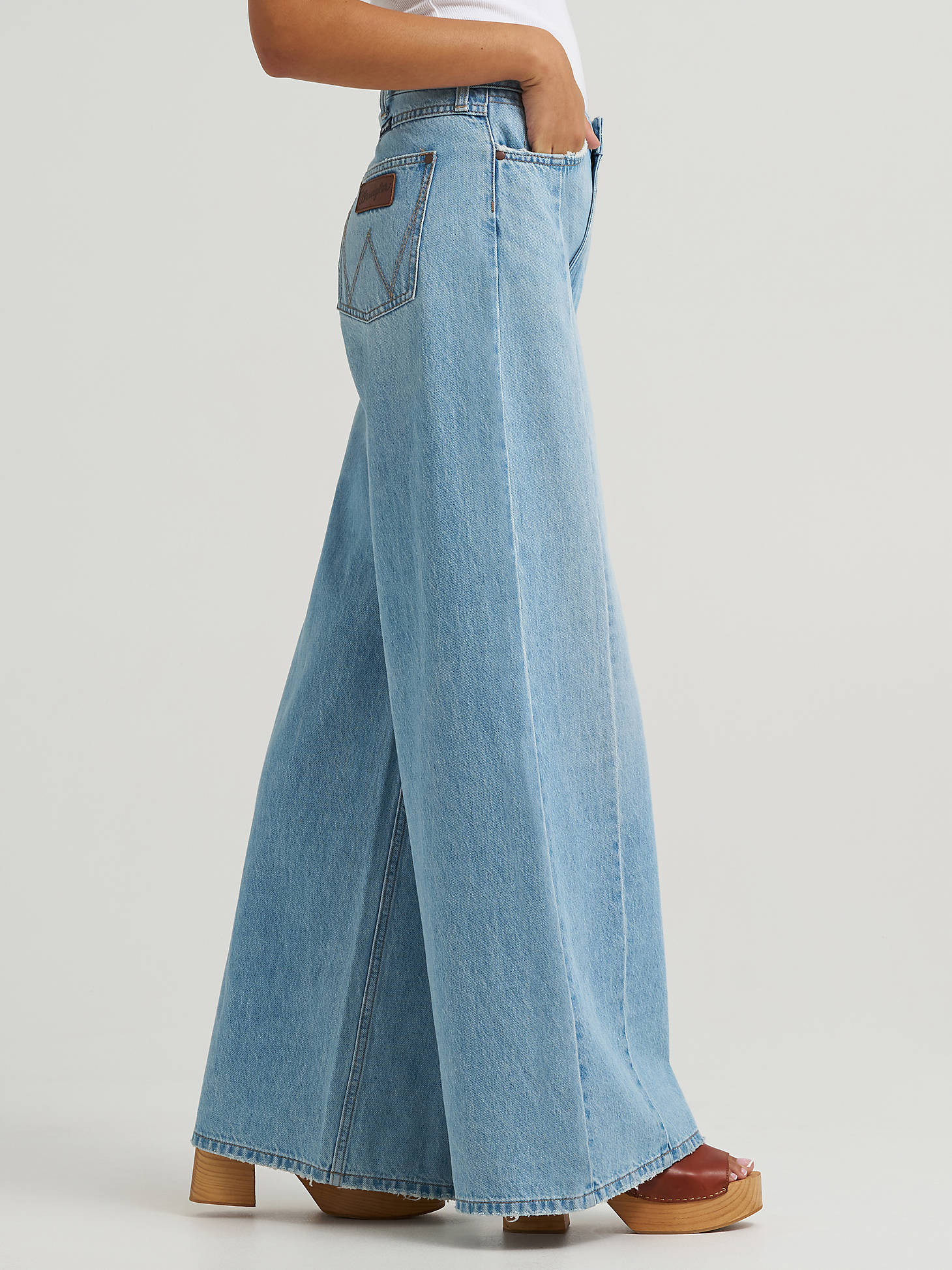 wrangler bailey high rise wide leg seams down the middle light blue light brown stitching boltranchstore.com
