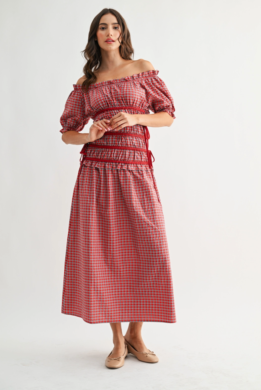 red and blue checkered gingham dress red ties and bows midi dress doen dupe boltranchstore.com Bolt Ranch Store Christmas dress off the shoulder poofy sleeve free shipping