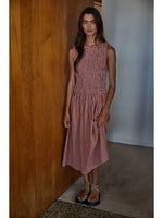 This sleeveless midi dress features a woven cotton gingham fabric with a smocked bodice and a round neckline, flowing into a flared silhouette. It is designed without lining for a lightweight feel.