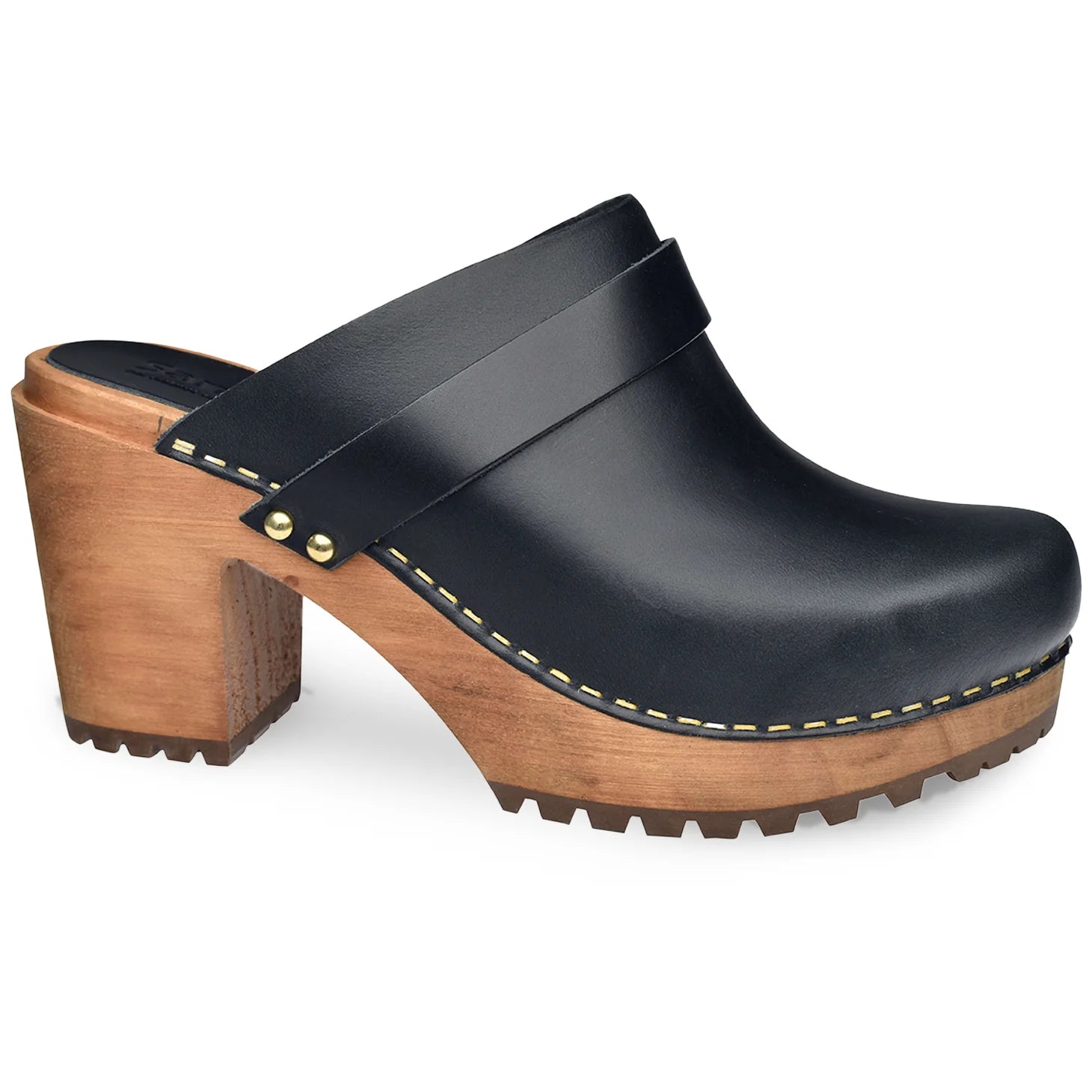 Introducing the Peleni Women's where traditional Danish craftsmanship meets modern elegance. These clogs feature a smooth leather upper, exuding sophistication and comfort with every step. The chunky 9cm high heel adds a bold and fashionable touch, ensuring you stand tall and confident. The loafer detail at the front adds a classic charm, seamlessly blending timeless design with contemporary flair. Perfect for any occasion, these wooden clogs are the ultimate statement piece for the fashion-forward individual.
