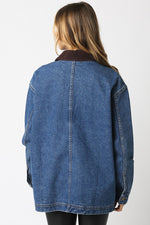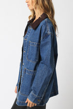The Kate Denim Jacket features a button down and a corduroy collar detailing with patched front pockets.