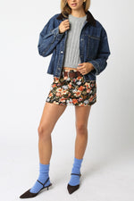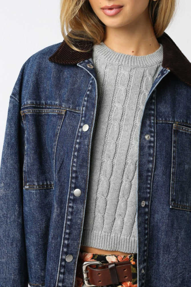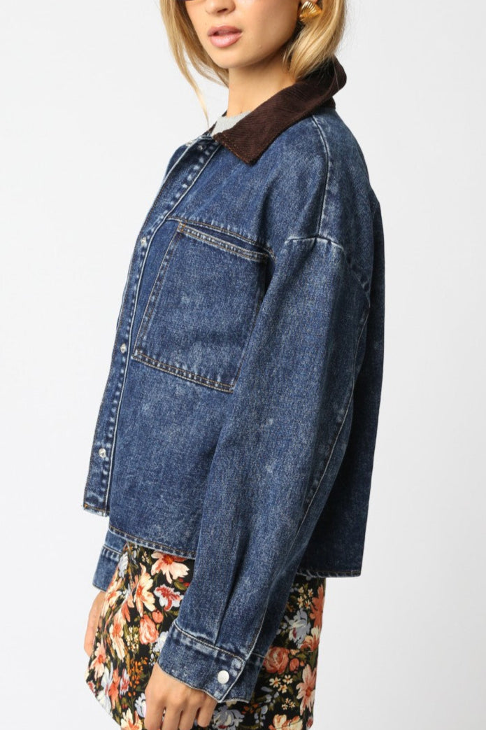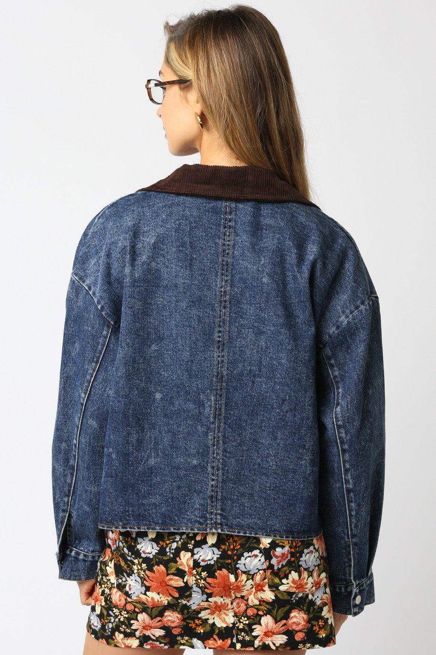 The Riley Denim Barn Jacket offers a stylish cropped cut complemented by a cozy corduroy collar.