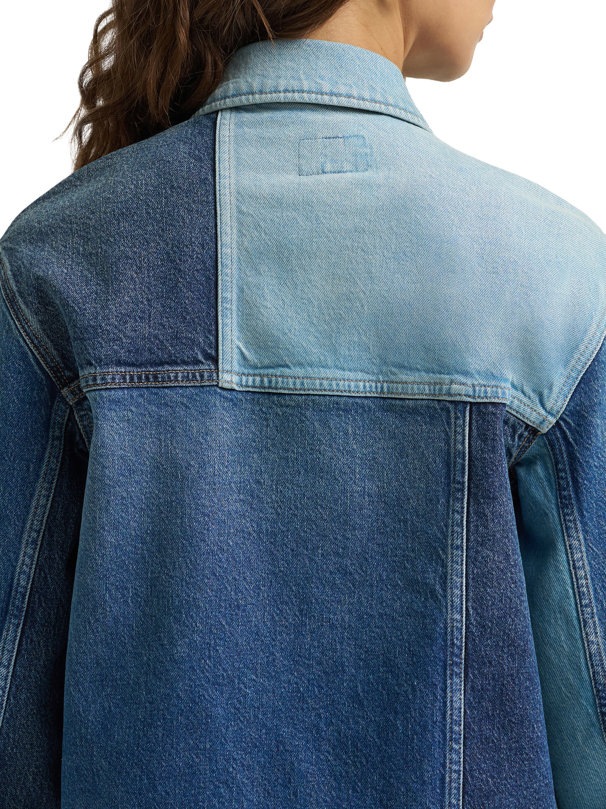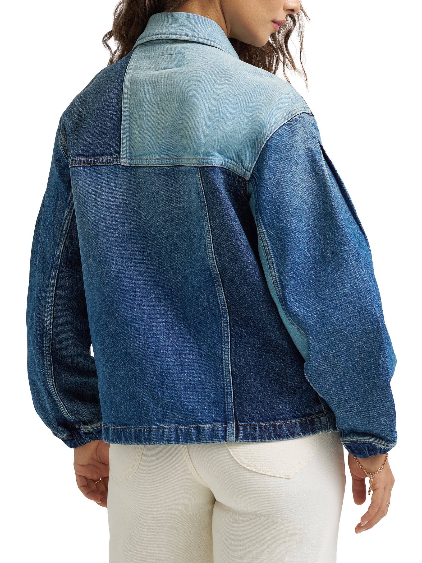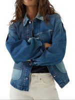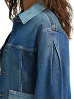 Let your denim jacket be a work of art. This unique chore jacket is pieced together from multiple patches of denim for that upcycled vibe with a professional touch. Complete with a waist-length hem and a swing-style back for an extra femme touch, it’s the one jacket that always fits just right.