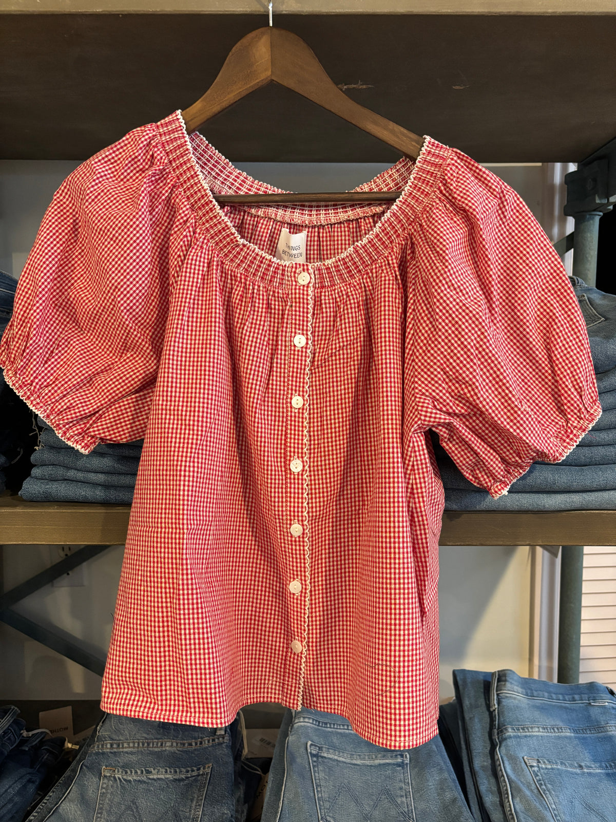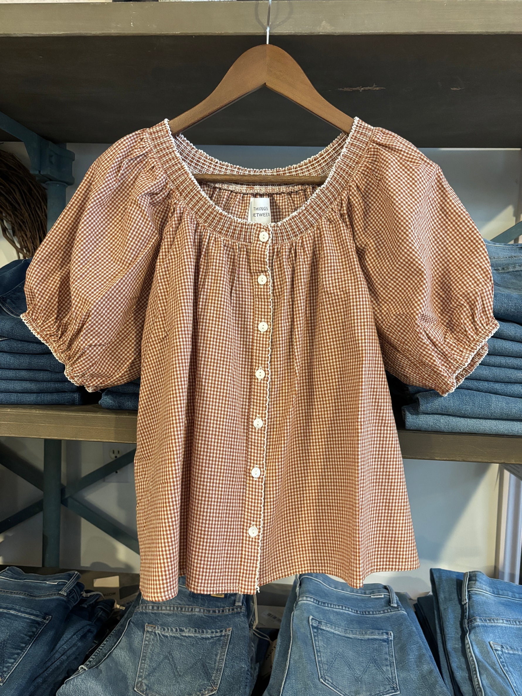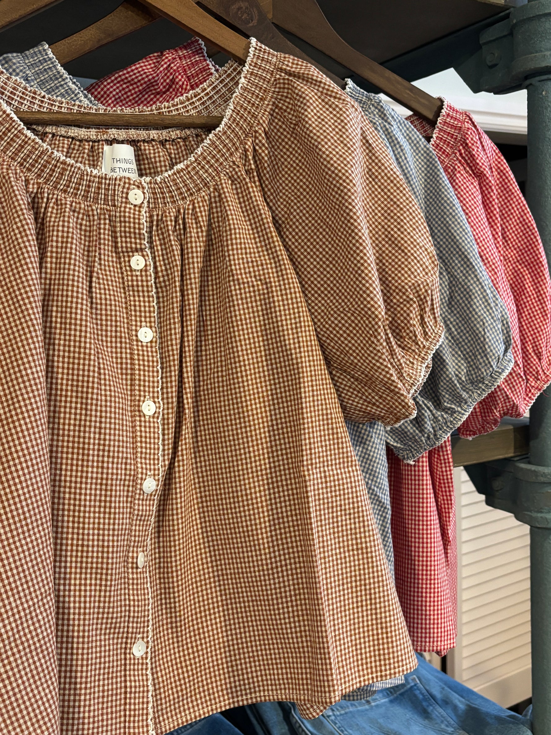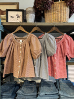 checkered blouse with puff sleeves thanksgiving outfit holiday shirt everyday shirt boltranchstore.com