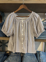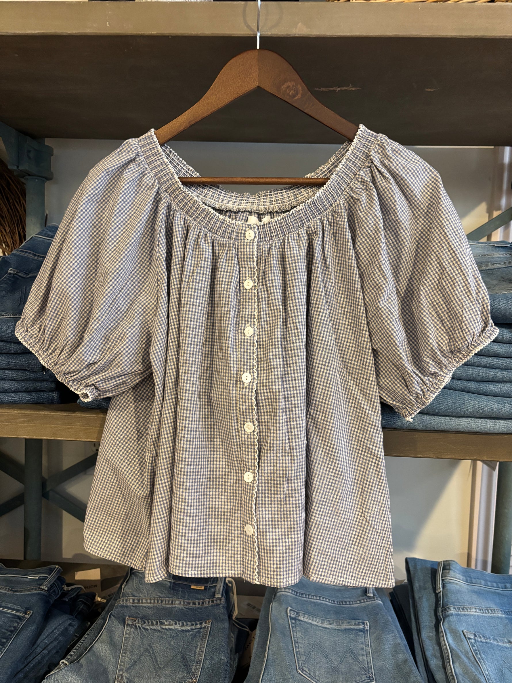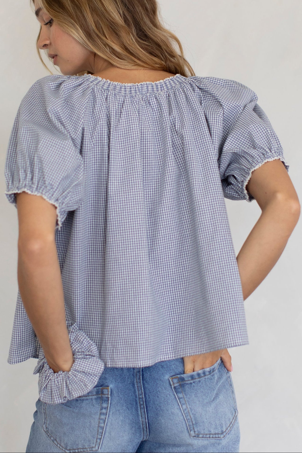 Introducing the Charly Checker Puff Blouse a sophisticated staple defined by its iconic checkered pattern and elegantly proportioned quarter puff sleeves. The full button front allows you to style with precision for the office or drape casually over basics for weekend elegance. Structured sleeves add dimensional interest while preserving the refined, understated quality this piece embodies. Paired with a matching scrunchie, this versatile blouse seamlessly transitions between your professional commitments and relaxed social moments with effortless poise.