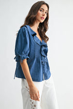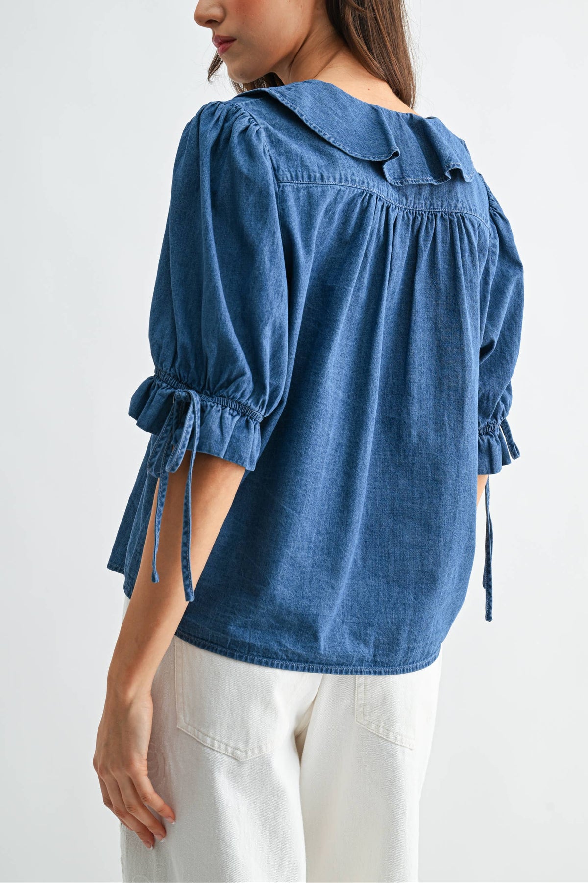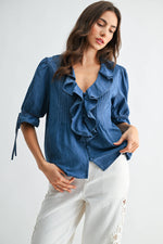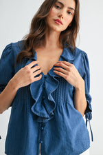 Cally Denim Pleated Ruffle Blouse womens denim top cute popular Boltranchstore.com western clothing fashion free shipping