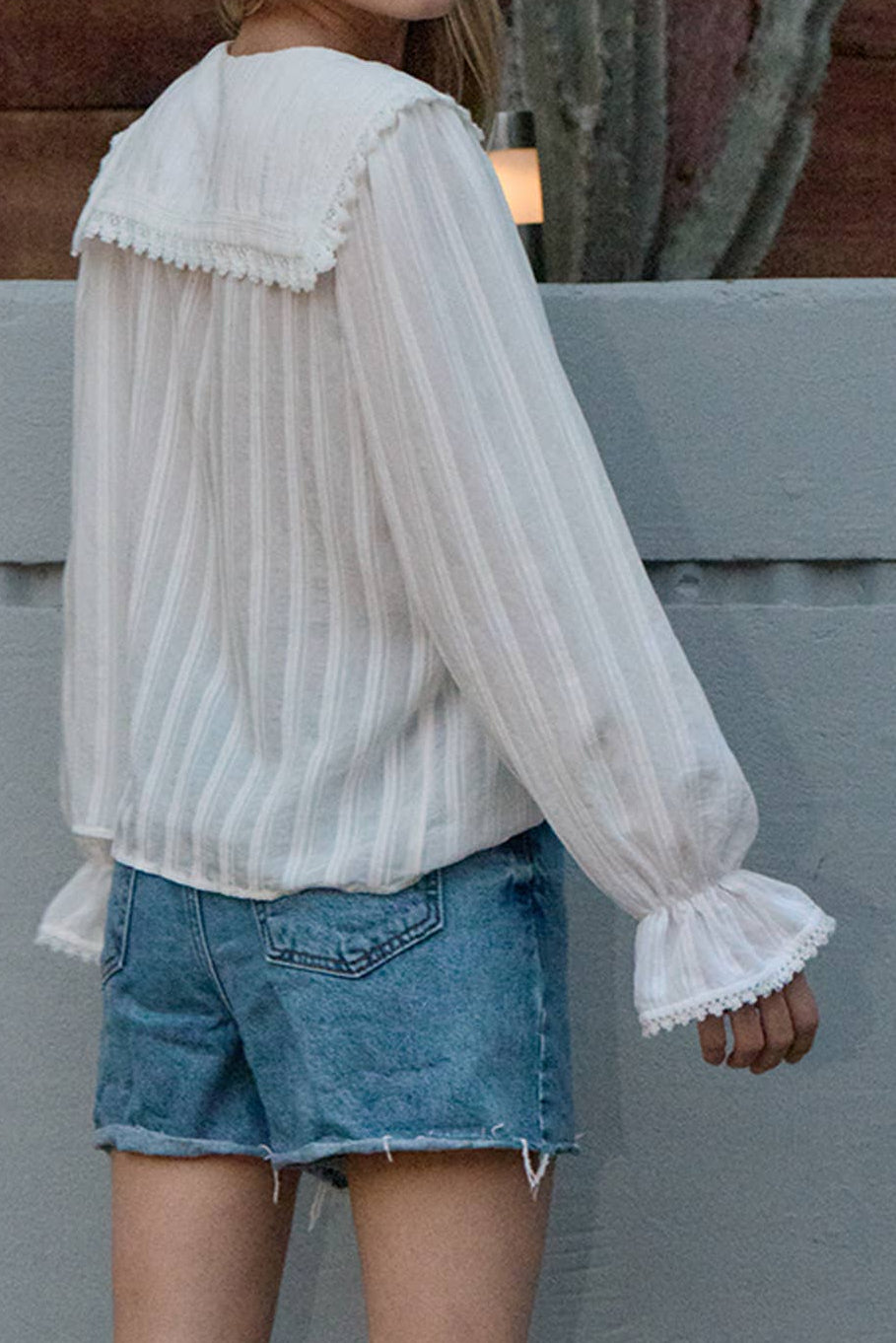 • Wide statement back yoke with lace edge sleeves with gathered cuffs
