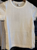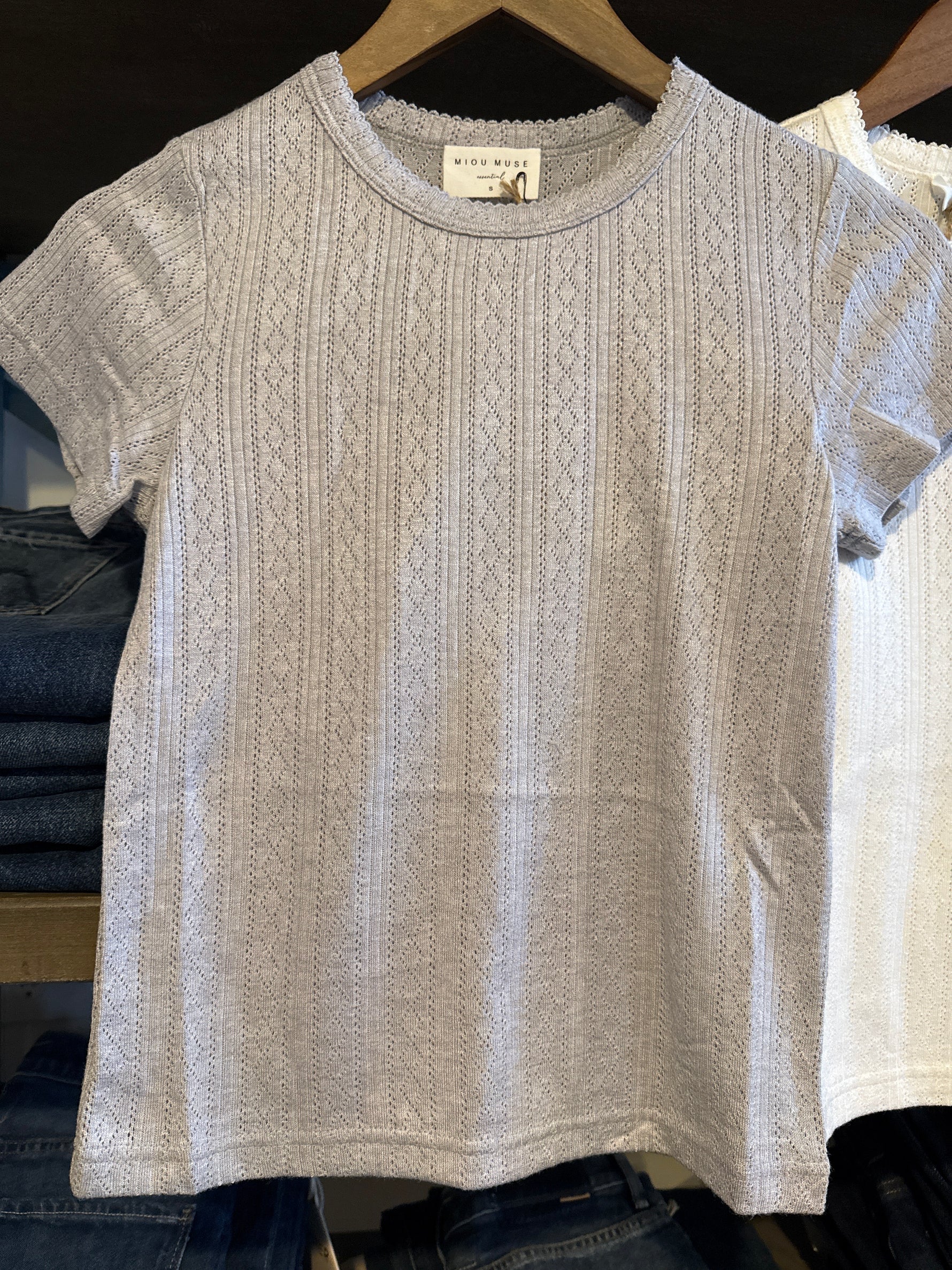 Pauline Pointelle Short Sleeve Top, featuring a delicate scalloped round collar that adds feminine sophistication to any look. The soft, breathable fabric drapes beautifully against your skin, making it perfect for layering or wearing solo during warmer months. Short sleeves keep things fresh and effortless, while the refined pointelle texture brings subtle visual interest and dimension. Whether you're dressing up for brunch or keeping it casual, this versatile piece transitions seamlessly from day to night.